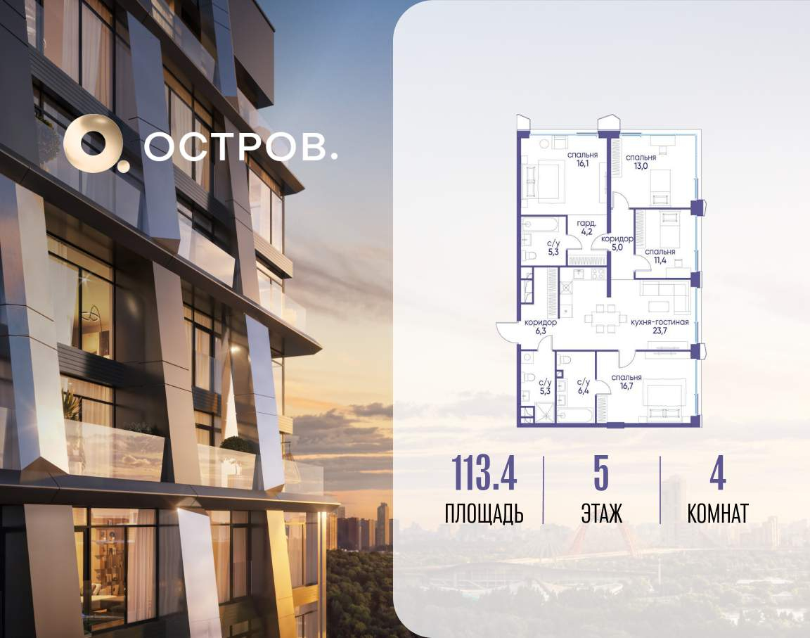 Продаётся 4-комн. квартира от застройщика: общая площадь 113.40 м, жилая 57.20 м, кухня 23.70 м, 5-й этаж, жилой квартал «Остров 12», корпус 3 (секция 1) . Срок сдачи: 1 квартал 2029 года.