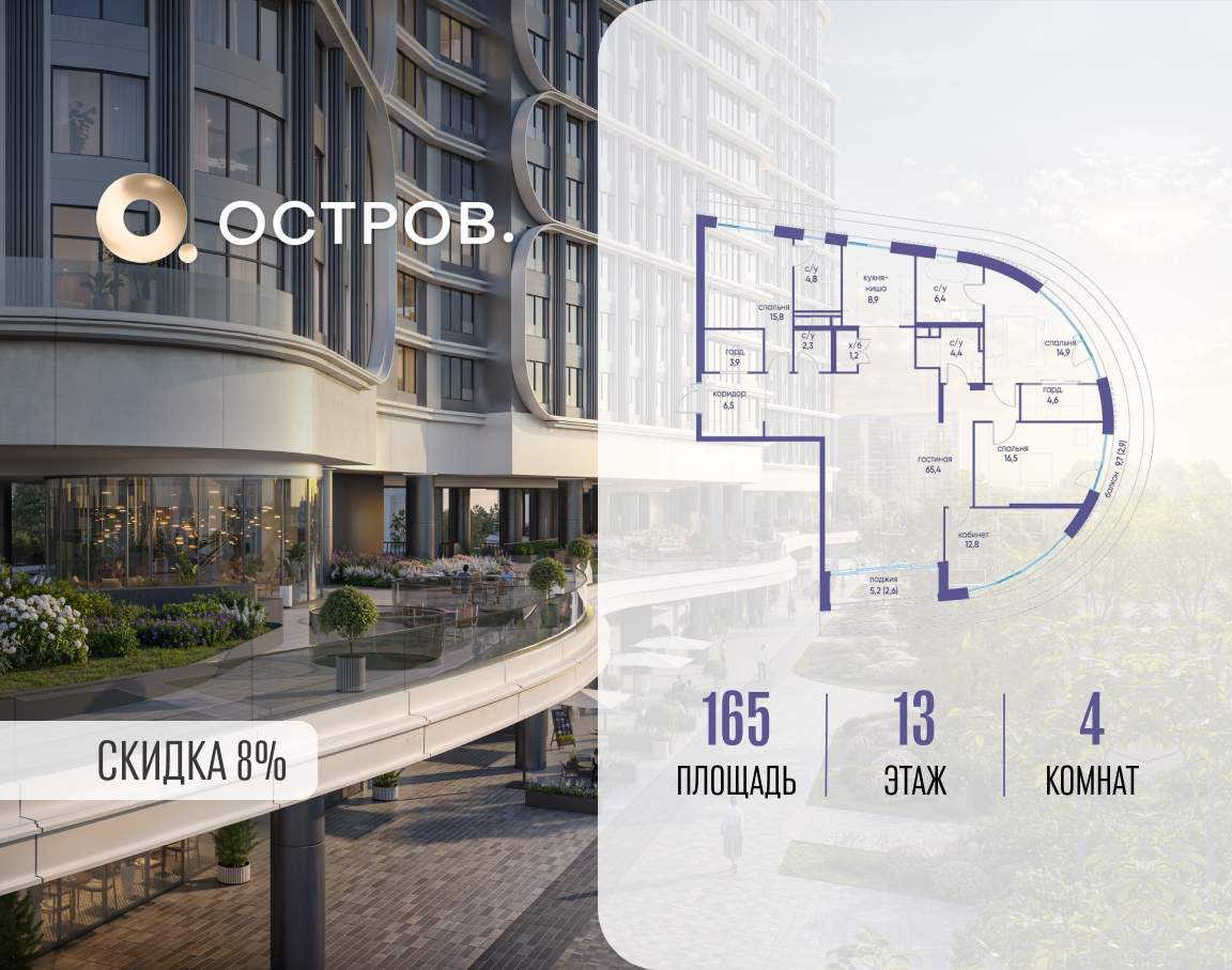 Продаётся 4-комн. квартира от застройщика: общая площадь 165.00 м, жилая 60.00 м, кухня 74.30 м, 13-й этаж, жилой квартал «Остров 7», корпус 4 (секция 1) . Срок сдачи: 1 квартал 2028 года.