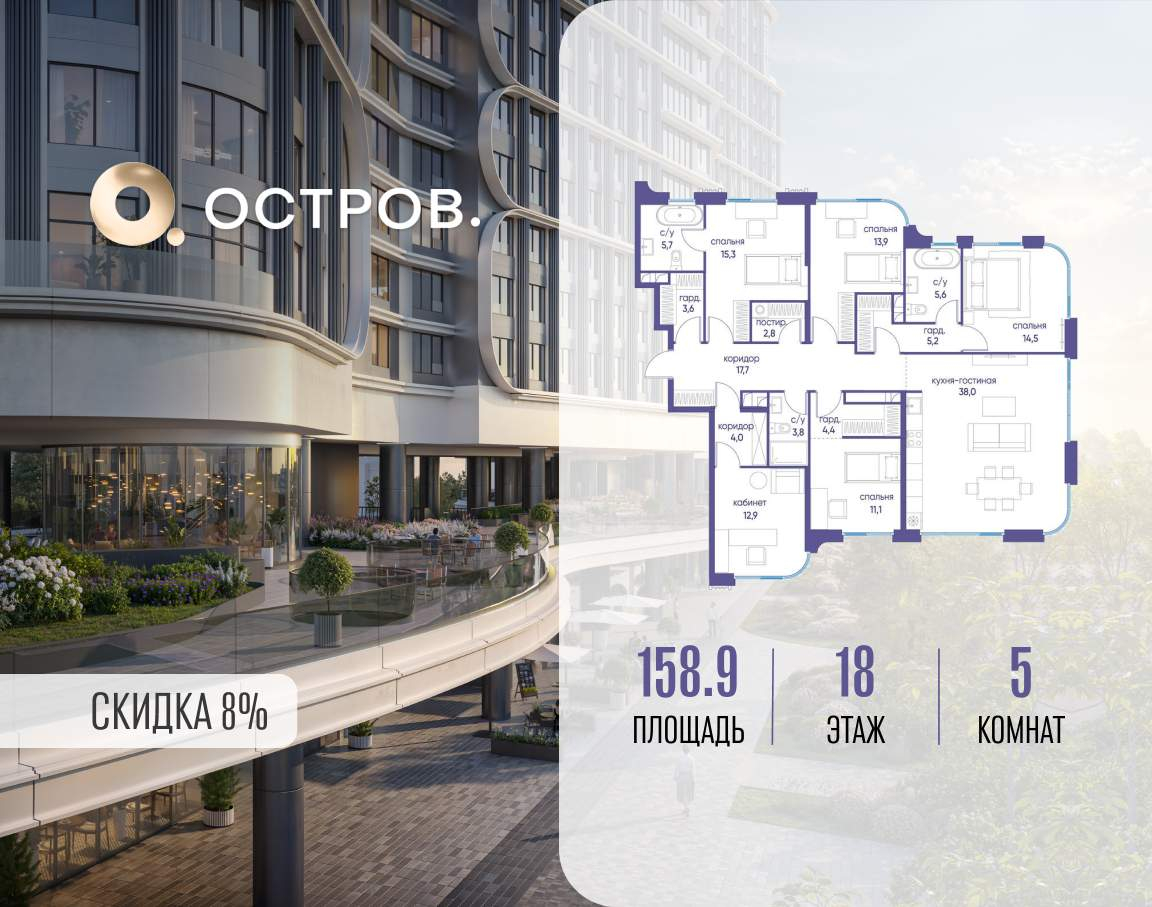 Продаётся квартира от застройщика: общая площадь 158.90 м, жилая 67.70 м, кухня 38.00 м, 18-й этаж, жилой квартал «Остров 7», корпус 2 (секция 1) . Срок сдачи: 1 квартал 2028 года.