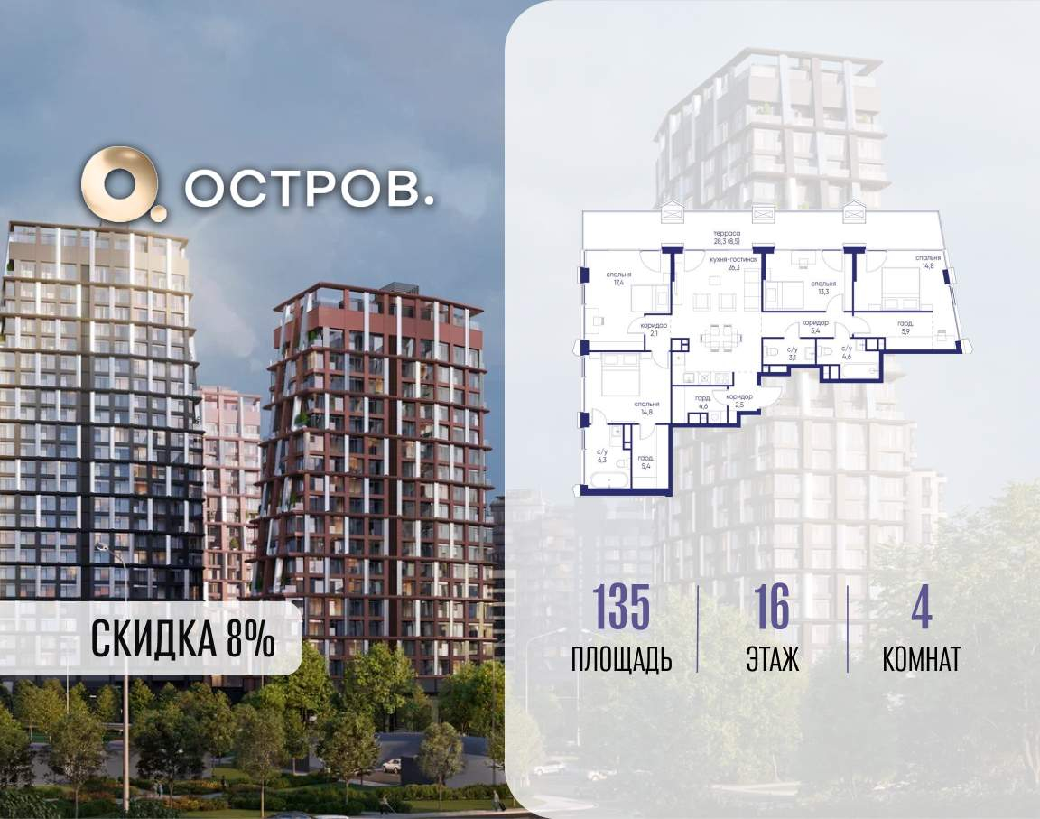 Продаётся 4-комн. квартира от застройщика: общая площадь 135.00 м, жилая 60.30 м, кухня 26.30 м, 16-й этаж, жилой квартал «Остров 14», корпус 6 (секция 1) . Срок сдачи: 2 квартал 2029 года.