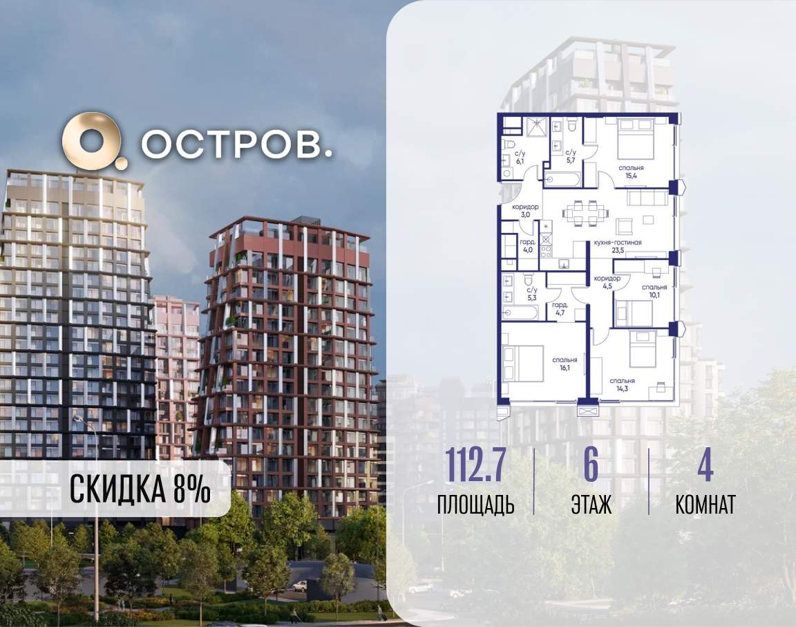 Продаётся 4-комн. квартира от застройщика: общая площадь 112.70 м, жилая 55.90 м, кухня 23.50 м, 6-й этаж, жилой квартал «Остров 14», корпус 4 (секция 1) . Срок сдачи: 2 квартал 2029 года.