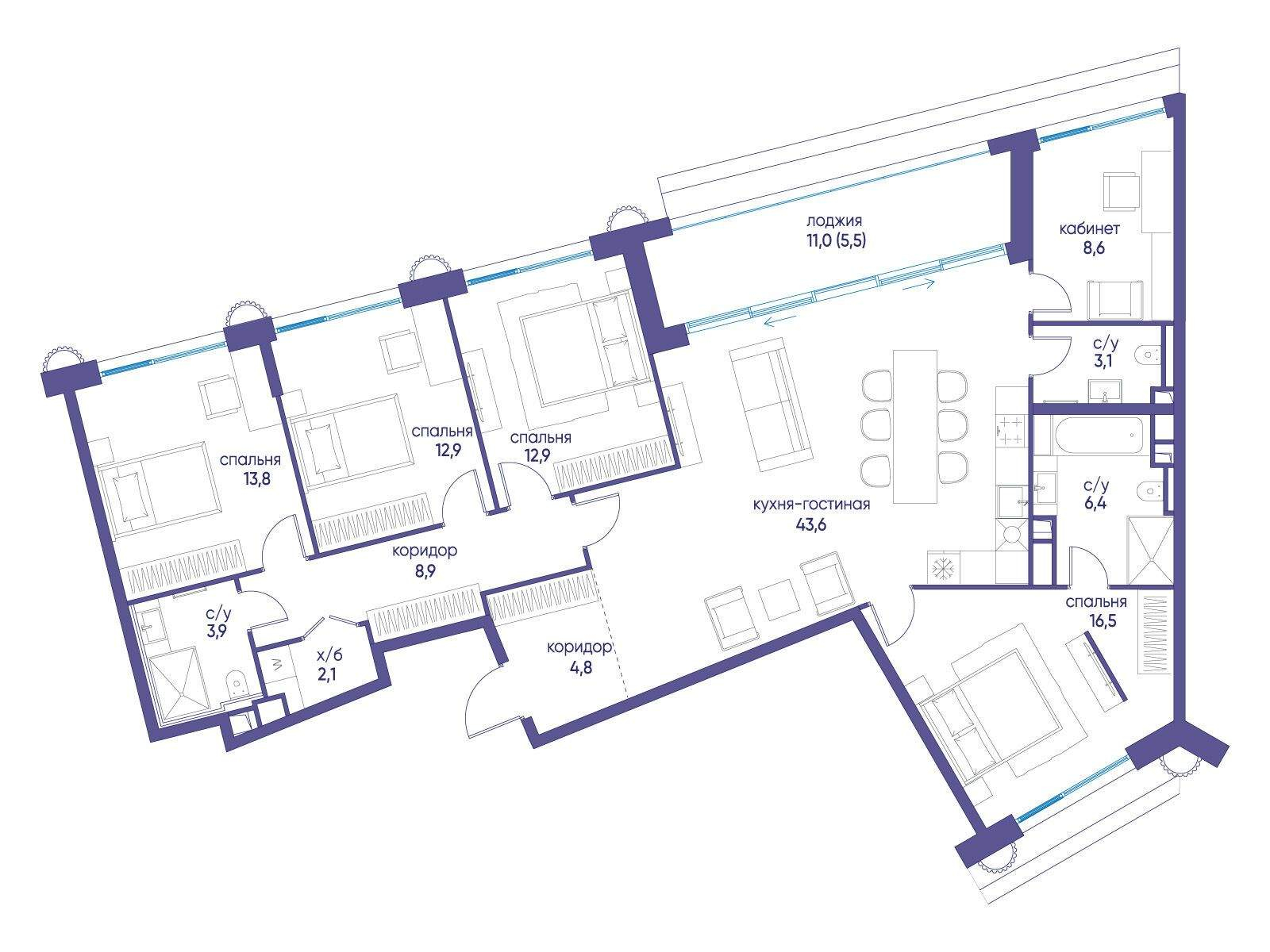 Продаётся квартира от застройщика: общая площадь 142.00 м, жилая 64.70 м, кухня 43.60 м, 9-й этаж, жилой квартал «Остров 7», корпус 7 (секция 1) . Срок сдачи: 3 квартал 2028 года.