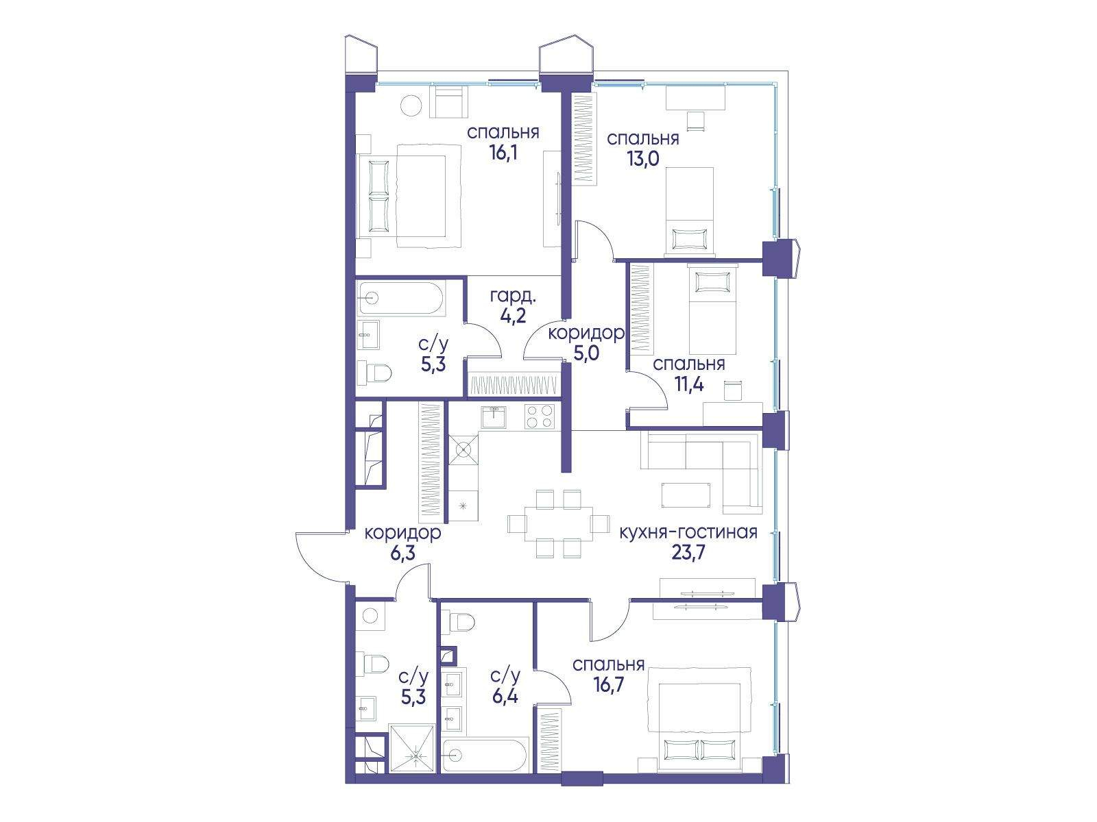 Продам 4-комнатную квартиру в новостройке 113.4 м.кв.