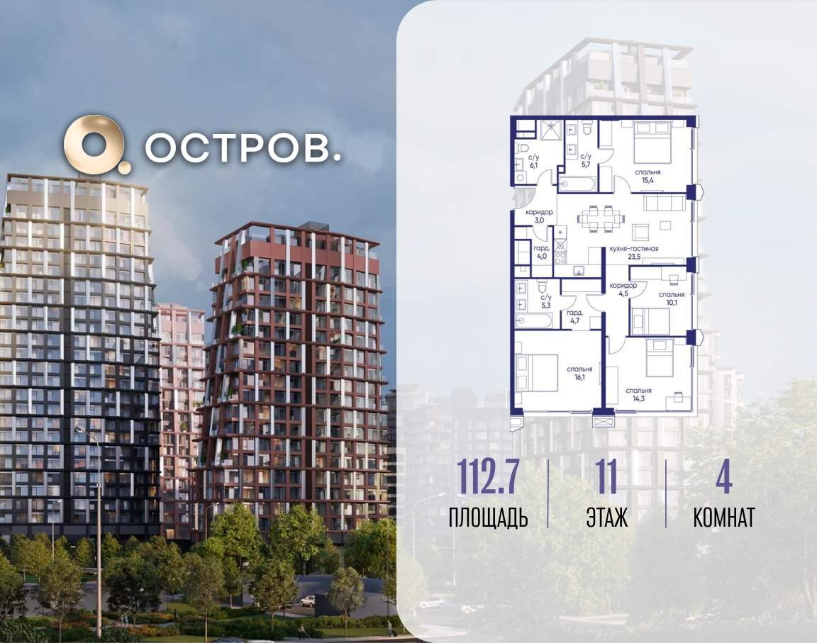 Продаётся 4-комн. квартира от застройщика: общая площадь 112.70 м, жилая 55.90 м, кухня 23.50 м, 11-й этаж, жилой квартал «Остров 14», корпус 4 (секция 1) . Срок сдачи: 2 квартал 2029 года.