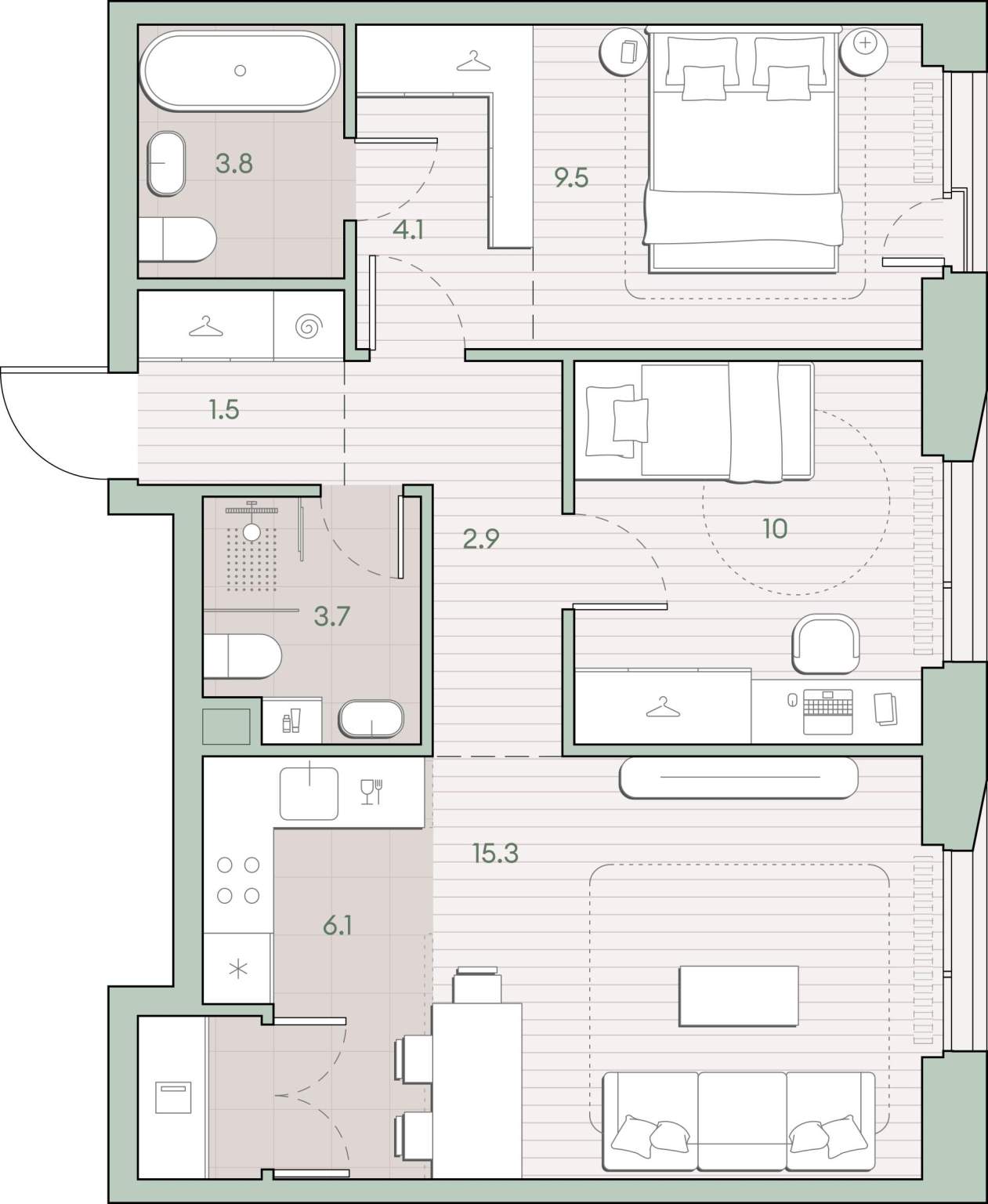 Жилая площадь 34.8 м2, кухня 6.1 м2, предчистовая отделка, комнаты изолированные.
