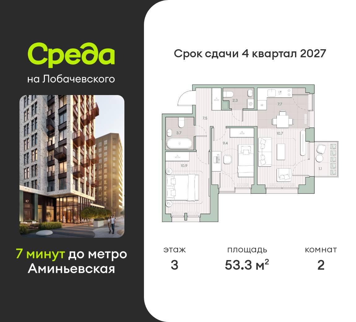 Застройщик - Среда, сдача дома - II квартал 2027 года, высота потолков 2.92 м.