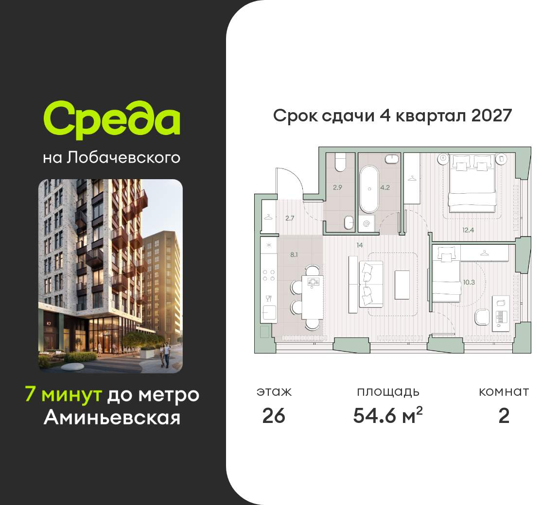 Застройщик - Среда, сдача дома - IV квартал 2027 года, высота потолков 2.92 м.
