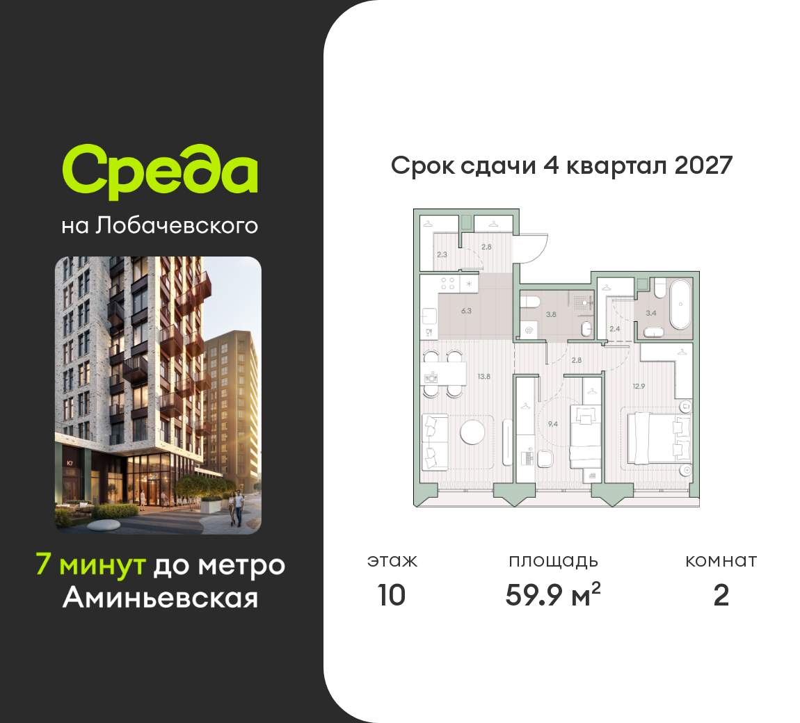 Квартира располагается на 10 этаже 13-этажного дома в ЖК Среда на Лобачевского.