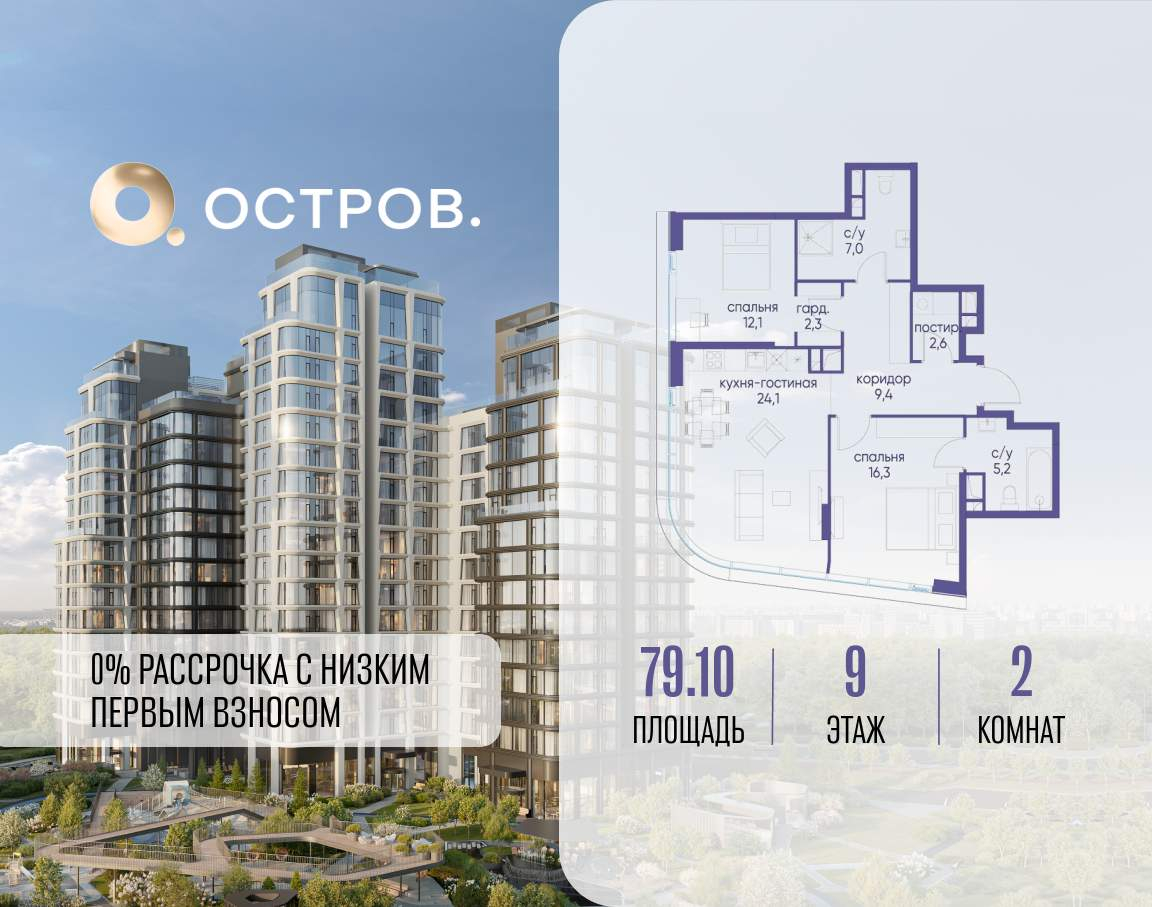 Продаётся 2-комн. квартира от застройщика: общая площадь 79.10 м, жилая 28.40 м, кухня 24.10 м, 9-й этаж, жилой квартал «Остров 12», корпус 6 (секция 1) . Срок сдачи: 1 квартал 2029 года.