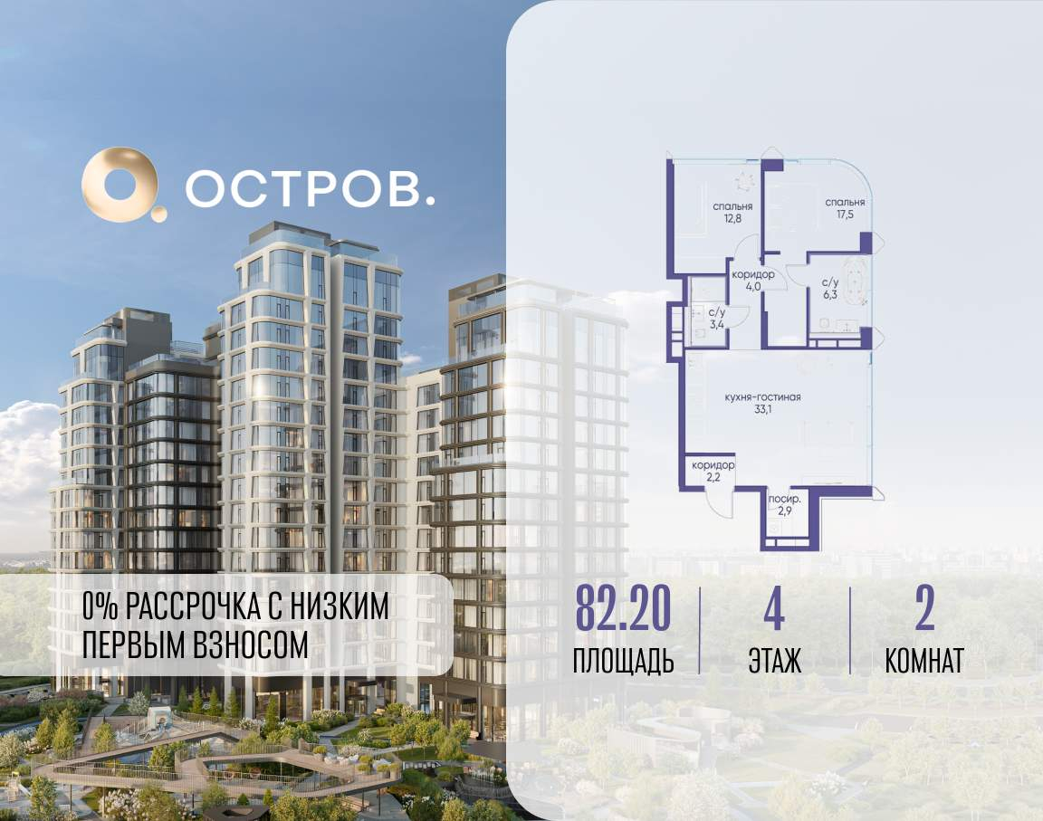Продаётся 2-комн. квартира от застройщика: общая площадь 82.20 м, жилая 30.30 м, кухня 33.10 м, 4-й этаж, жилой квартал «Остров 12», корпус 2 (секция 2) . Срок сдачи: 1 квартал 2029 года.