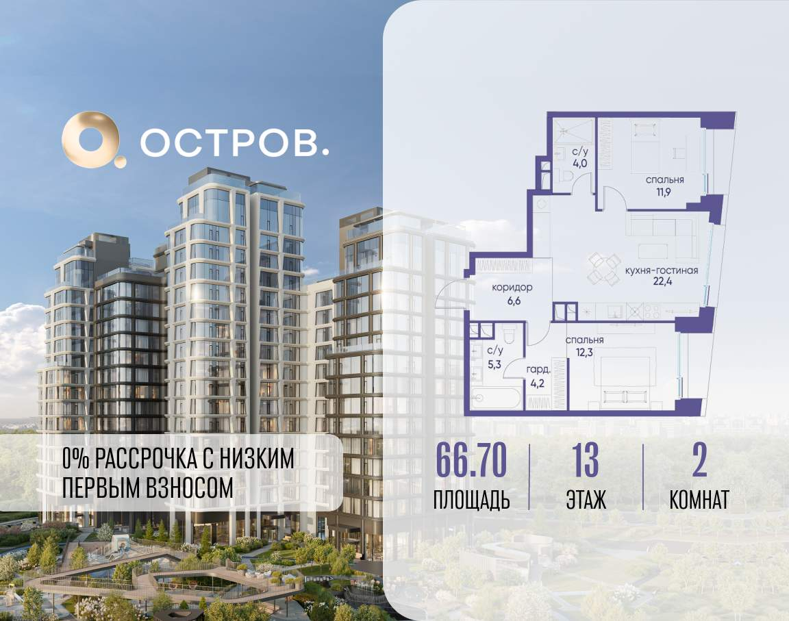 Продаётся 2-комн. квартира от застройщика: общая площадь 66.70 м, жилая 24.20 м, кухня 22.40 м, 13-й этаж, жилой квартал «Остров 12», корпус 1 (секция 2) . Срок сдачи: 1 квартал 2029 года.