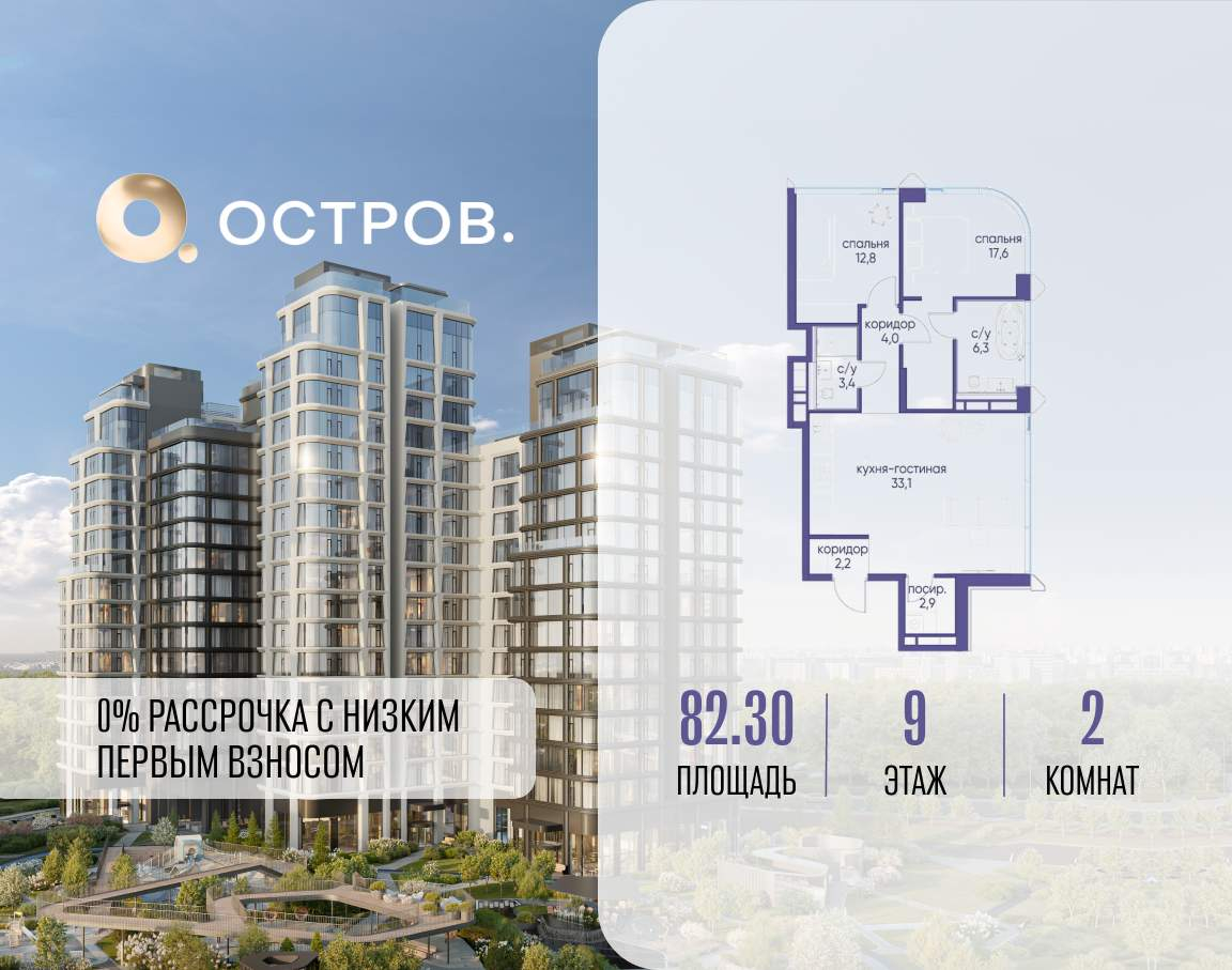 Продаётся 2-комн. квартира от застройщика: общая площадь 82.30 м, жилая 30.40 м, кухня 33.10 м, 9-й этаж, жилой квартал «Остров 12», корпус 2 (секция 2) . Срок сдачи: 1 квартал 2029 года.