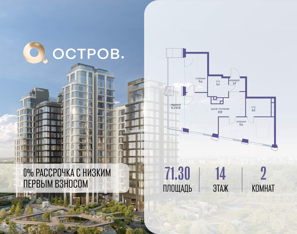 ОСТРОВ от Донстрой - жилой комплекс на западе Москвы, в Мневниковской пойме. Уникальное преимущество комплекса - в том, что он обособлен от города рекой и природным парком (650 га) . Благодаря природному окружению эта территория имеет лучший экологический рейтинг в столице. Кварталы ОСТРОВА объединены ландшафтным дизайном в единое пространство - с набережными и Центральным бульваром. На ОСТРОВЕ любые объекты, необходимые для полноценной жизни и отдыха, находятся на расстоянии 15-минутной прогулки. Торговый центр и супермаркеты, кафе и рестораны, фитнес, салоны красоты, школы и детские сады. А также крупнейший в Москве спортивный кластер.