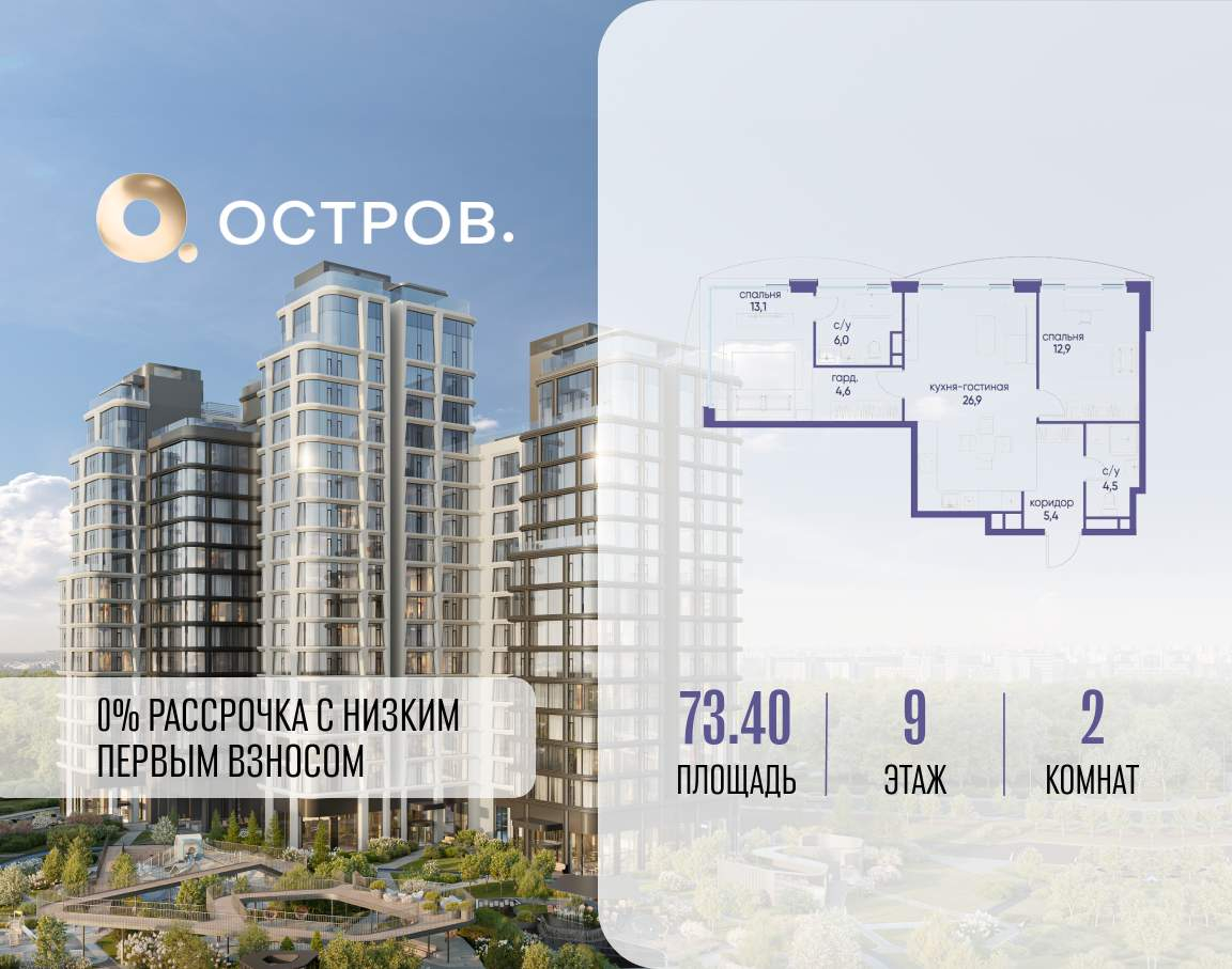 Продаётся 2-комн. квартира от застройщика: общая площадь 73.40 м, жилая 26.00 м, кухня 26.90 м, 9-й этаж, жилой квартал «Остров 12», корпус 4 (секция 1) . Срок сдачи: 1 квартал 2029 года.