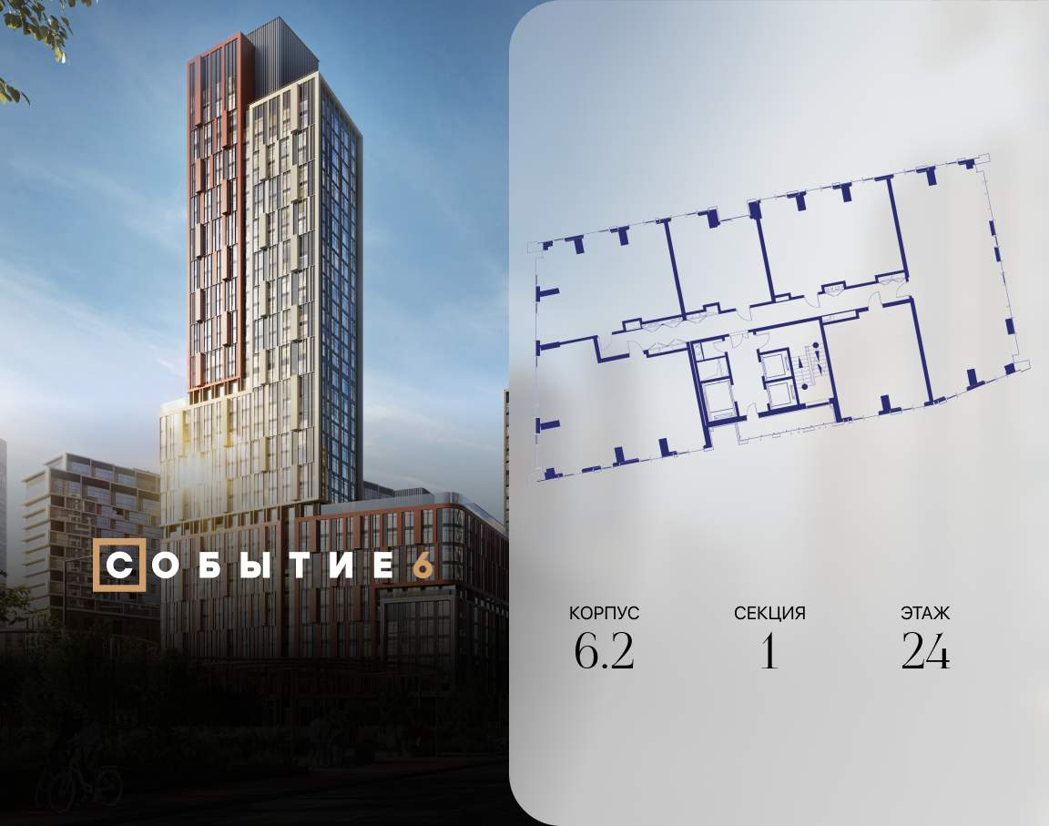 Продаётся 2-комнатная квартира от застройщика: общая площадь 72.60 м, жилая 31.80 м, кухня 24.10 м, 24-й этаж, жилой квартал «Событие-6», корпус 2 (секция 1) Срок сдачи: 1 квартал 2029 года.