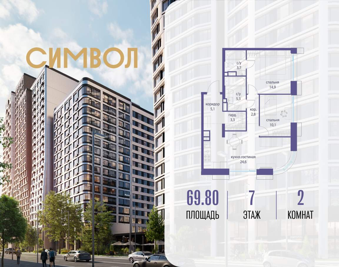 Продается 2-комнатная квартира от застройщика: общая площадь 69.80 м, жилая 25.00 м, кухня 24.60 м, 7-й этаж, жилой квартал «Гордость», корпус 36 (секция 5) . Срок сдачи: 2 квартал 2029 года.