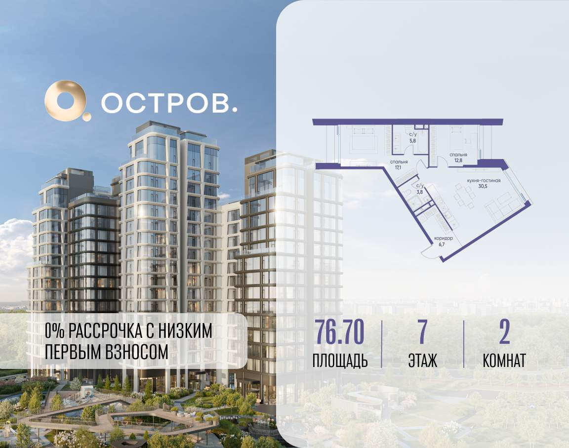 Продаётся 2-комн. квартира от застройщика: общая площадь 76.70 м, жилая 29.90 м, кухня 30.50 м, 7-й этаж, жилой квартал «Остров 12», корпус 1 (секция 1) . Срок сдачи: 1 квартал 2029 года.