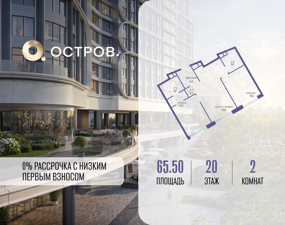 Продаётся 2-комн. квартира от застройщика: общая площадь 65.50 м, жилая 29.30 м, кухня 23.80 м, 20-й этаж, жилой квартал «Остров 7», корпус 7 (секция 1) . Срок сдачи: 3 квартал 2028 года.