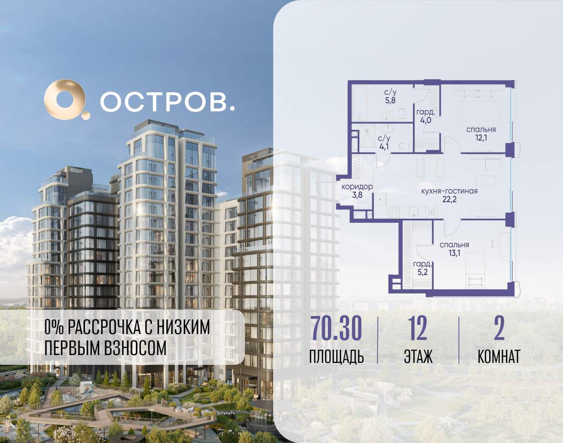 Продаётся 2-комн. квартира от застройщика: общая площадь 70.30 м, жилая 25.20 м, кухня 22.20 м, 12-й этаж, жилой квартал «Остров 12», корпус 3 (секция 1) . Срок сдачи: 1 квартал 2029 года.