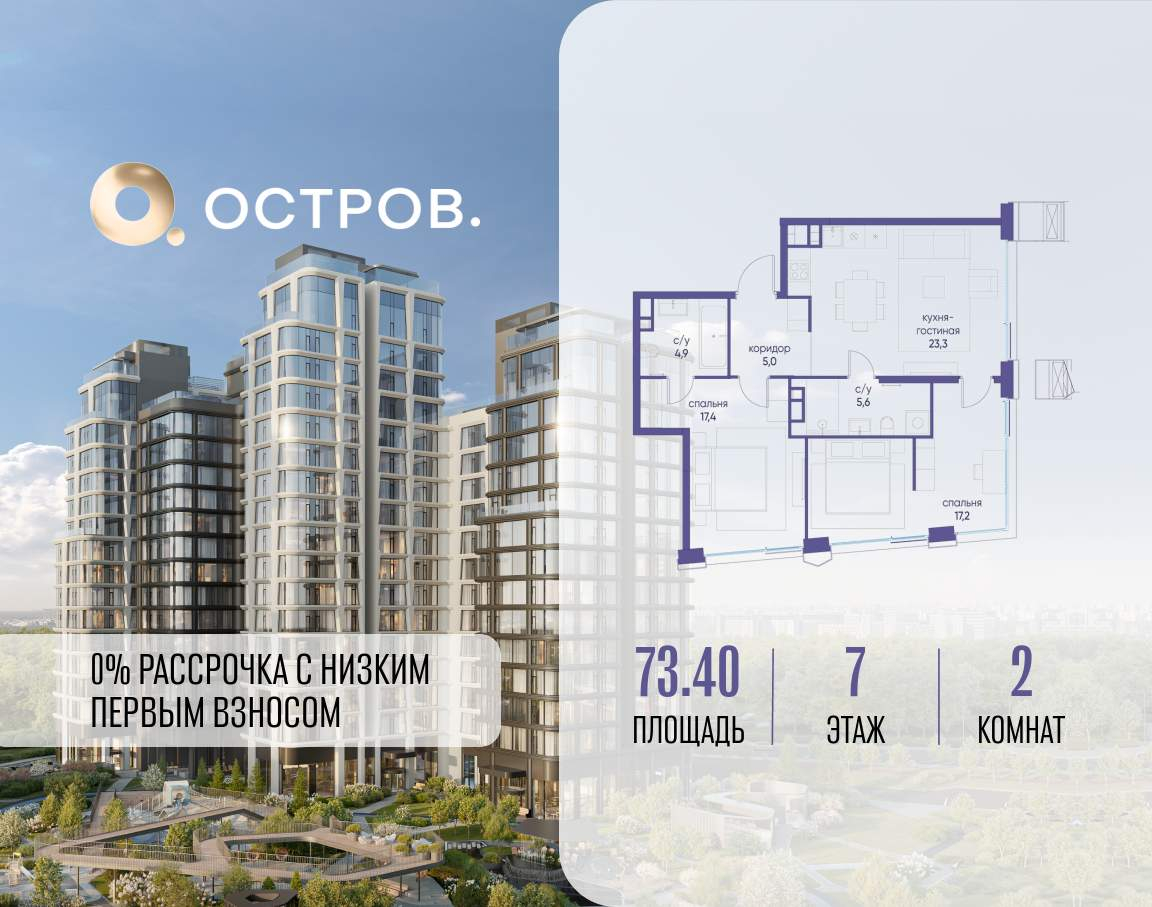 Продаётся 2-комн. квартира от застройщика: общая площадь 73.40 м, жилая 34.60 м, кухня 23.30 м, 7-й этаж, жилой квартал «Остров 12», корпус 2 (секция 1) . Срок сдачи: 1 квартал 2029 года.