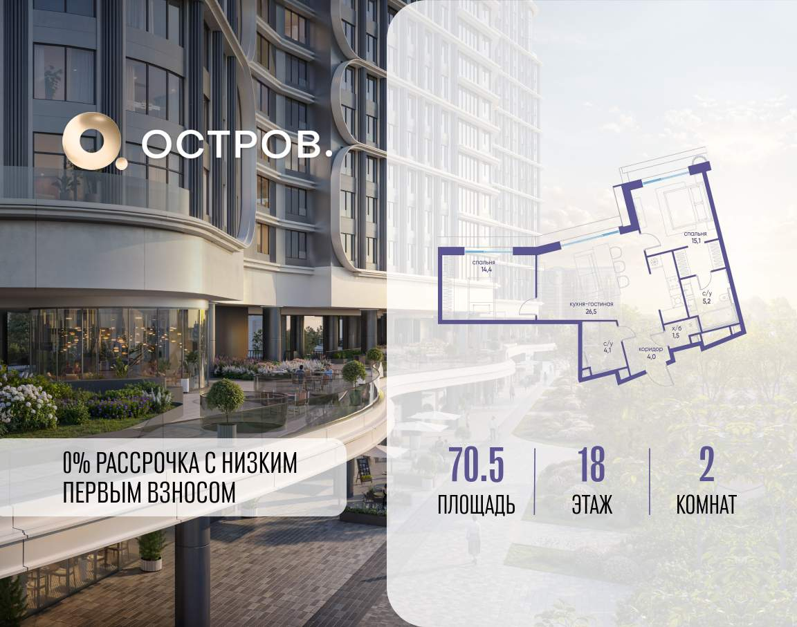 Продаётся 2-комн. квартира от застройщика: общая площадь 70.50 м, жилая 29.50 м, кухня 26.50 м, 18-й этаж, жилой квартал «Остров 7», корпус 7 (секция 1) . Срок сдачи: 3 квартал 2028 года.