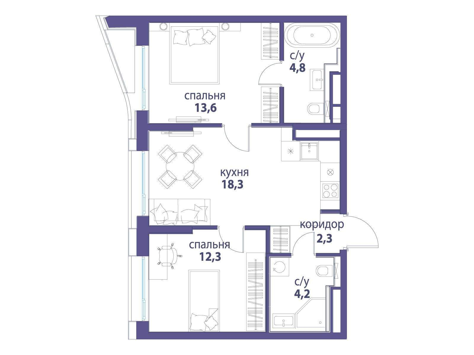 Продается 2-комнатная квартира от застройщика: общая площадь 55.50 м, жилая 25.90 м, кухня 18.30 м, 22-й этаж, жилой квартал «Вдохновение», корпус 33 (секция 3) . Срок сдачи: 4 квартал 2027 года.