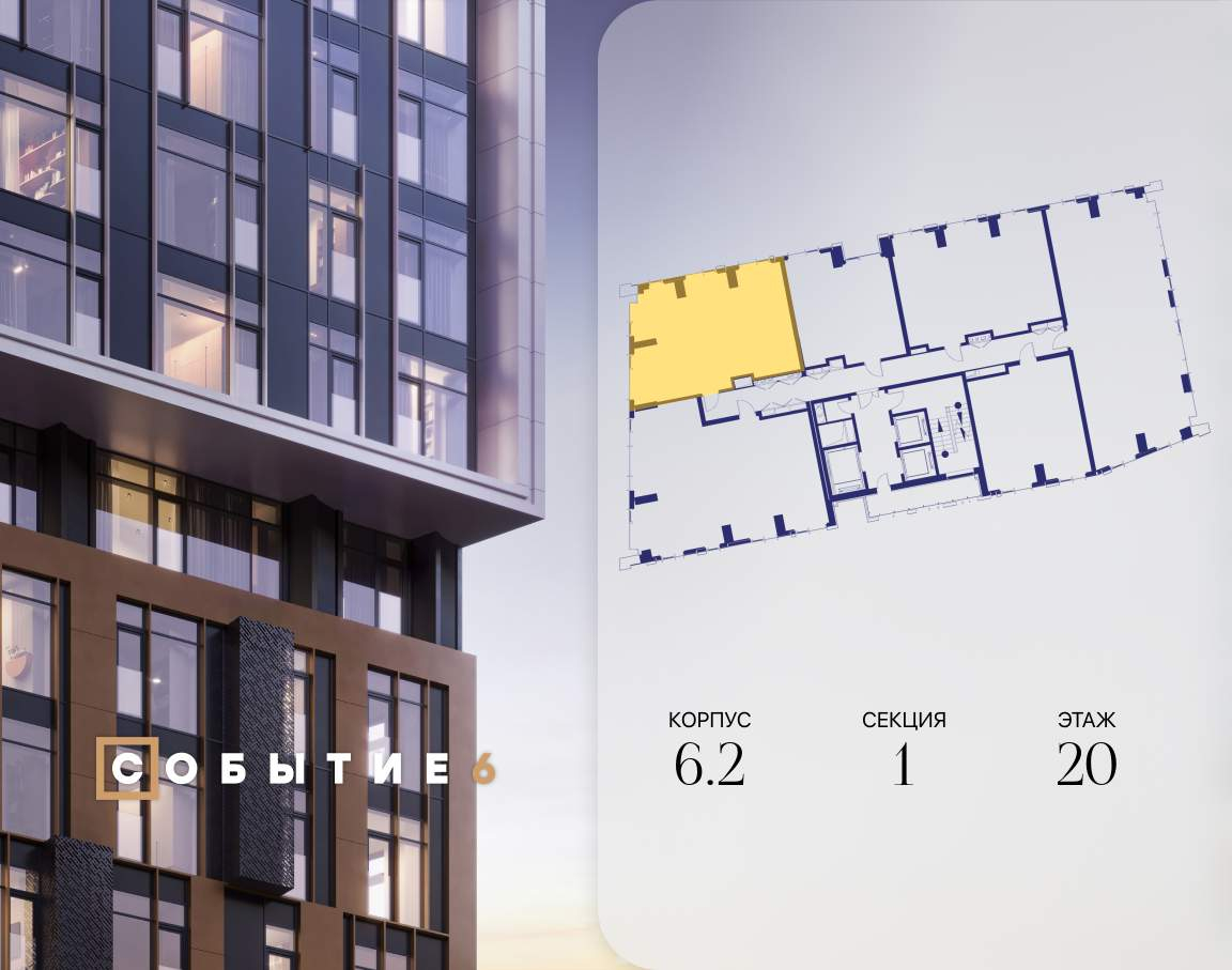Продаётся 2-комнатная квартира от застройщика: общая площадь 74.60 м, жилая 28.40 м, кухня 26.30 м, 20-й этаж, жилой квартал «Событие-6», корпус 2 (секция 1) Срок сдачи: 4 квартал 2029 года.