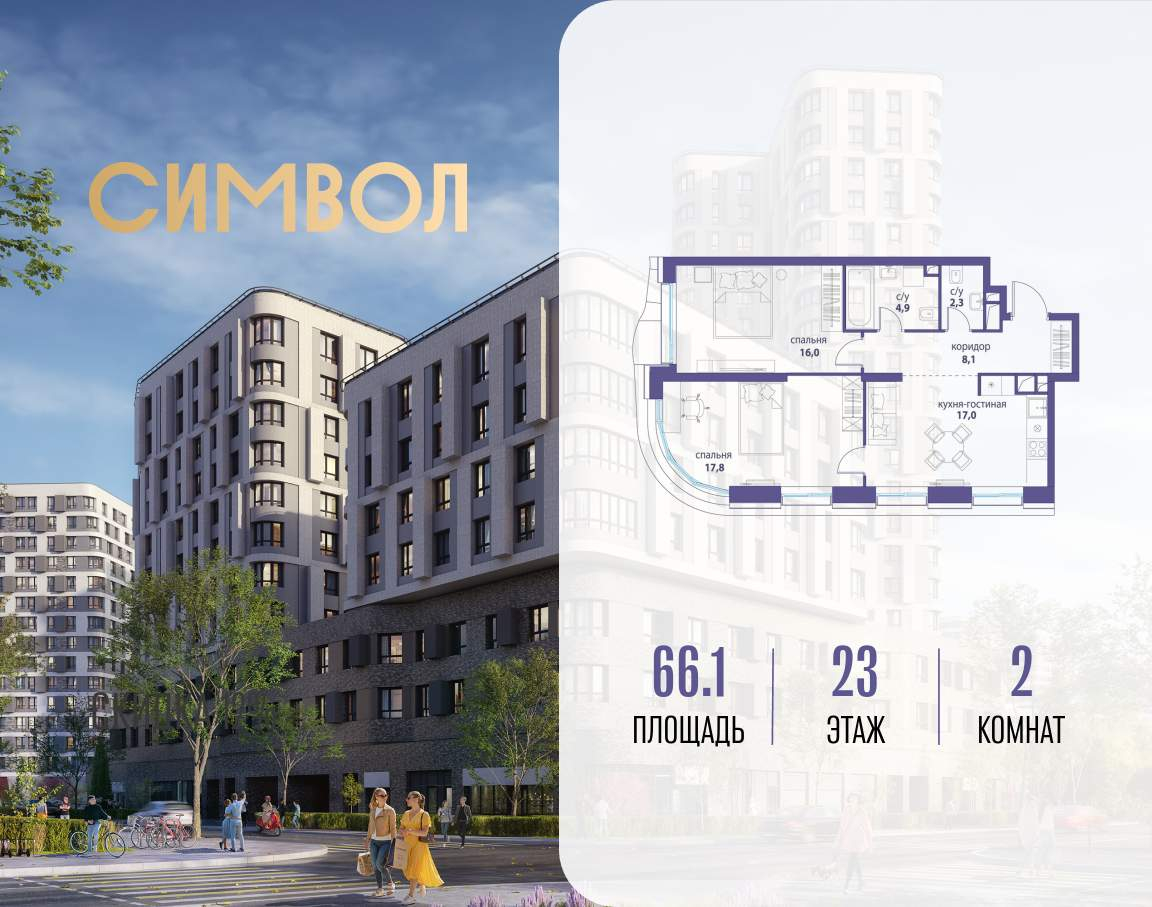 Продается 2-комнатная квартира от застройщика: общая площадь 66.10 м, жилая 33.80 м, кухня 17.00 м, 23-й этаж, жилой квартал «Вдохновение», корпус 35 (секция 1) . Срок сдачи: 4 квартал 2027 года.
