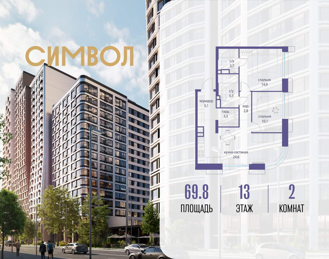 Продается 2-комнатная квартира от застройщика: общая площадь 69.80 м, жилая 25.00 м, кухня 24.60 м, 13-й этаж, жилой квартал «Гордость», корпус 36 (секция 5) . Срок сдачи: 2 квартал 2029 года.