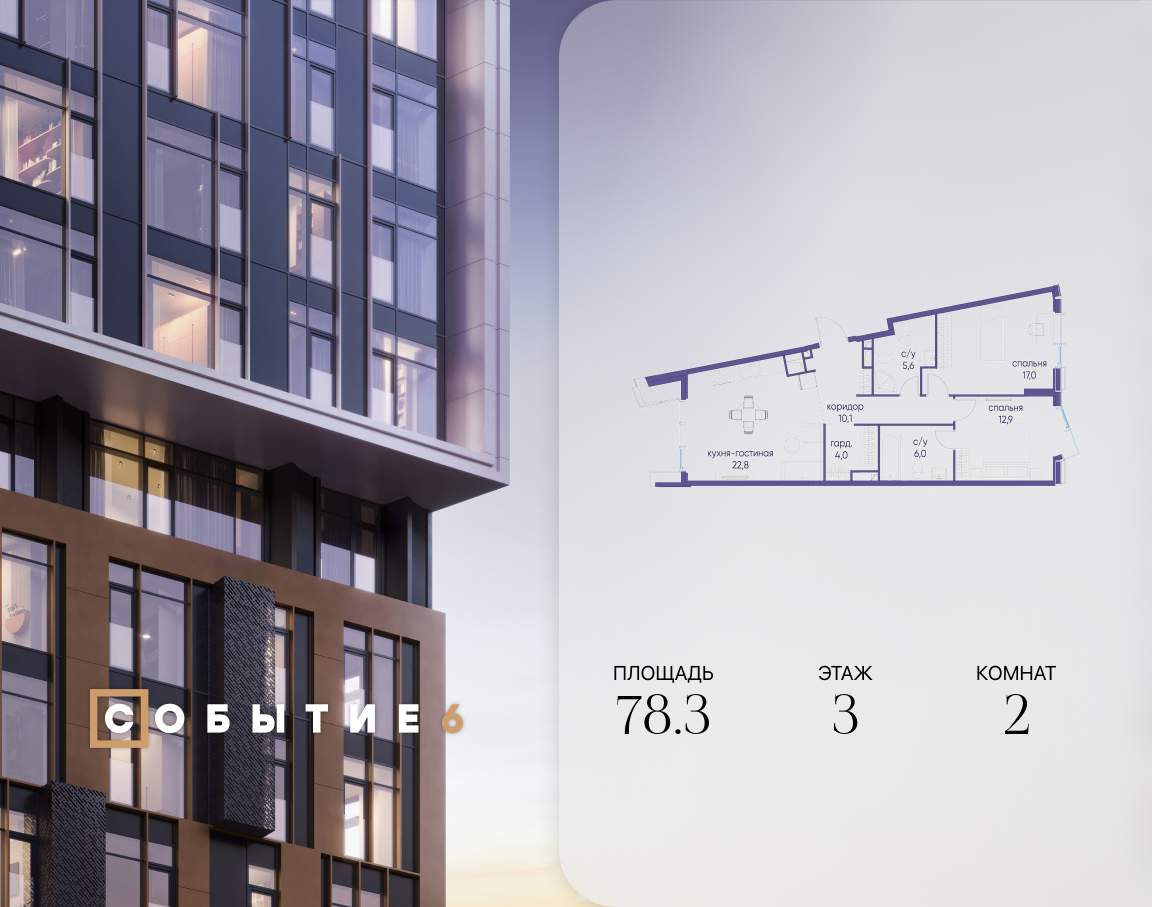 Продаётся 2-комнатная квартира от застройщика: общая площадь 78.30 м, жилая 29.90 м, кухня 22.80 м, 3-й этаж, жилой квартал «Событие-6», корпус 2 (секция 1) Срок сдачи: 4 квартал 2029 года.