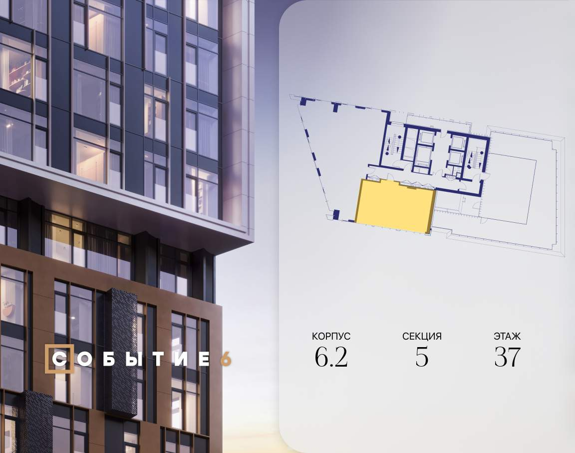 Продаётся 2-комнатная квартира от застройщика: общая площадь 62.10 м, жилая 33.00 м, кухня 17.80 м, 37-й этаж, жилой квартал «Событие-6», корпус 2 (секция 5) Срок сдачи: 4 квартал 2029 года.