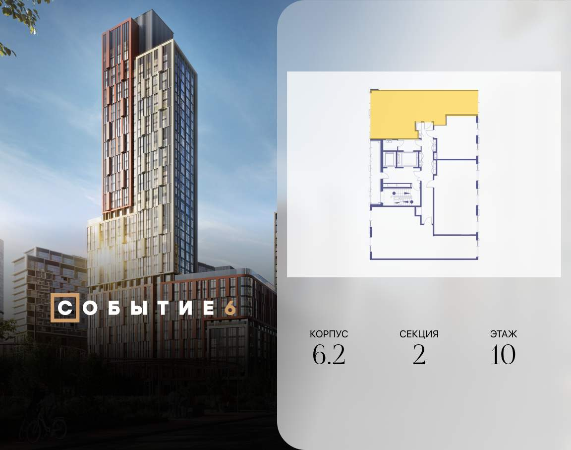 Продаётся 2-комнатная квартира от застройщика: общая площадь 74.50 м, жилая 30.40 м, кухня 27.20 м, 10-й этаж, жилой квартал «Событие-6», корпус 2 (секция 2) Срок сдачи: 1 квартал 2029 года.