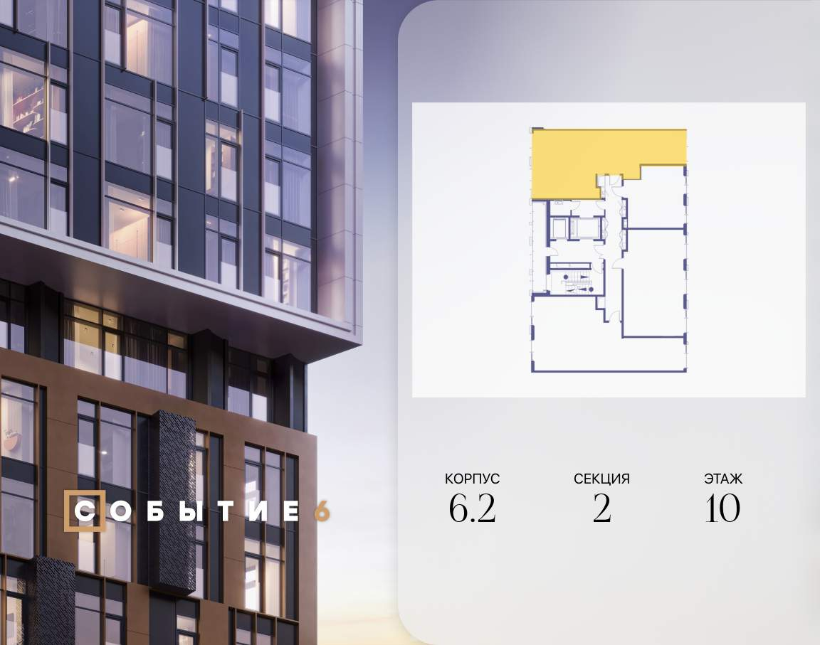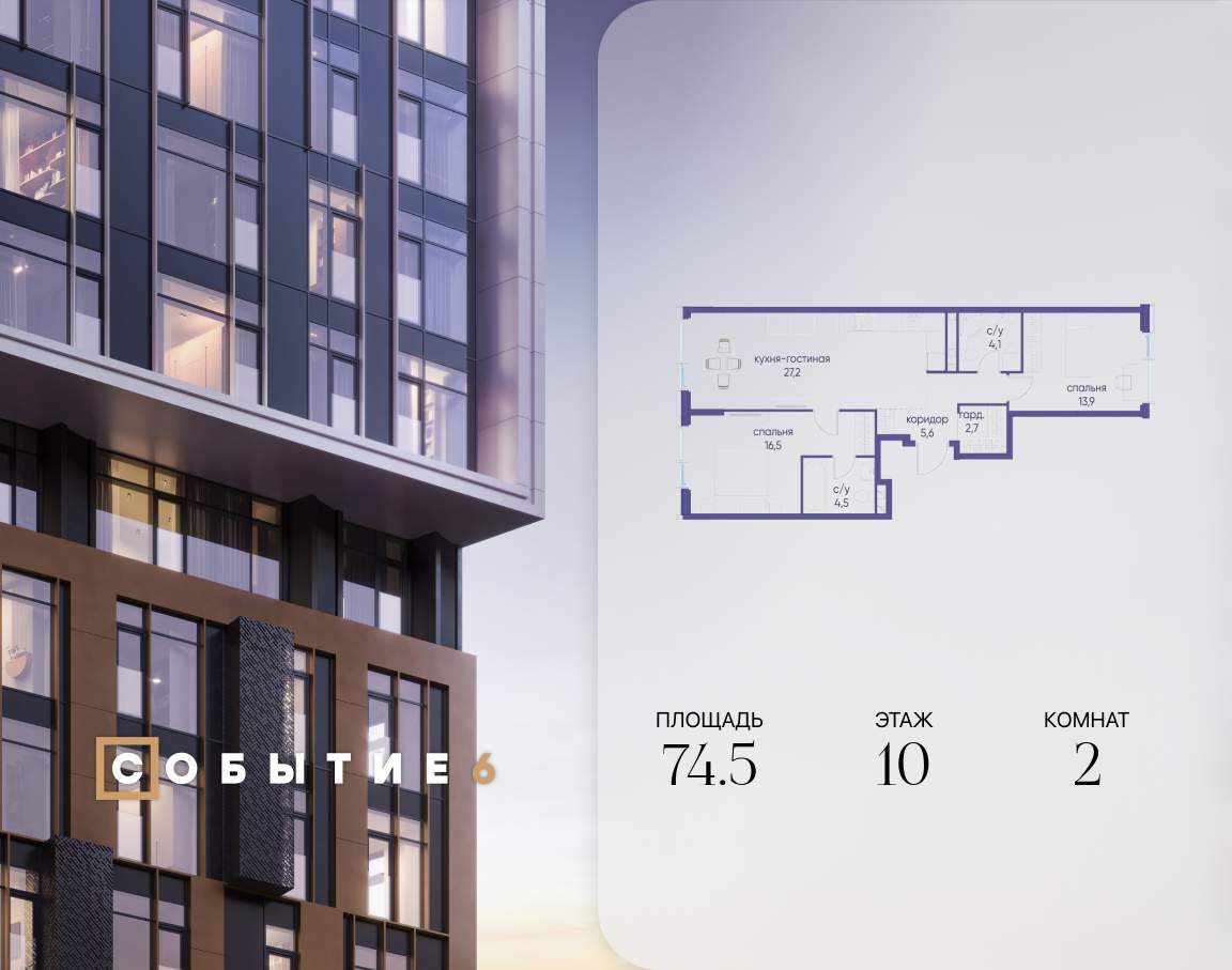 Продаётся 2-комнатная квартира от застройщика: общая площадь 74.50 м, жилая 30.40 м, кухня 27.20 м, 10-й этаж, жилой квартал «Событие-6», корпус 2 (секция 2) Срок сдачи: 4 квартал 2029 года.