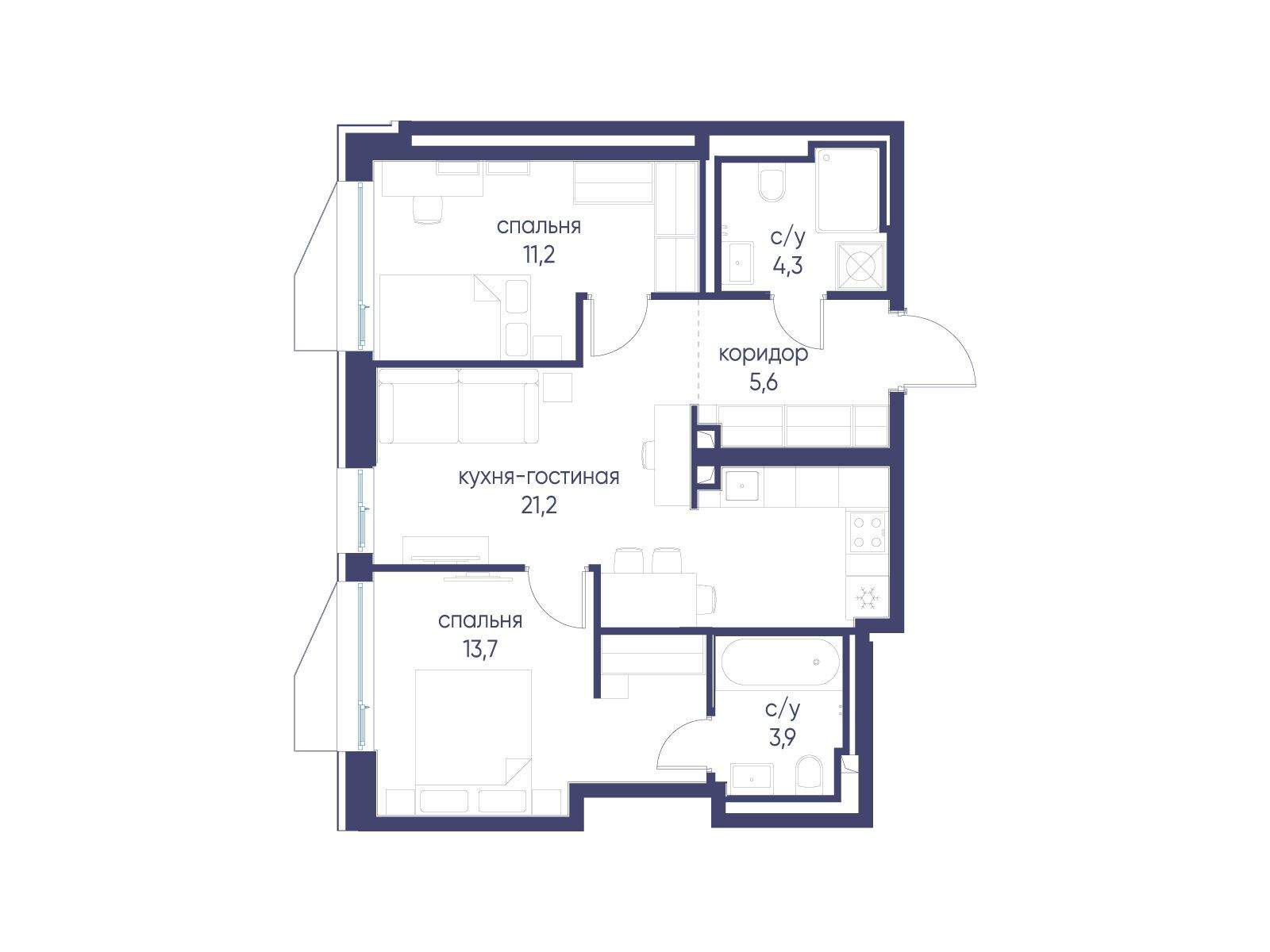 Продается 2-комнатная квартира от застройщика: общая площадь 59.90 м, жилая 24.90 м, кухня 21.20 м, 2-й этаж, жилой квартал «Гордость», корпус 40 (секция 1) . Срок сдачи: 2 квартал 2029 года.