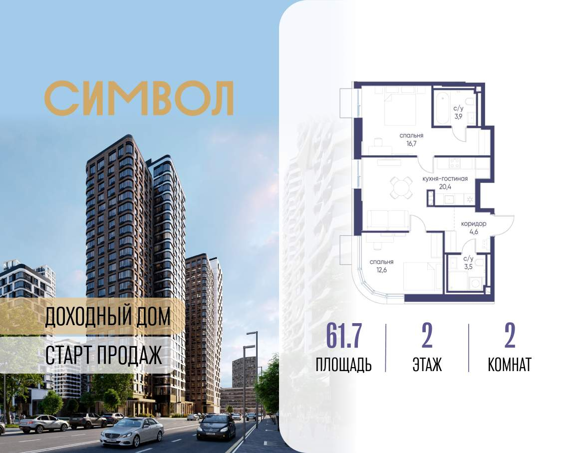Продается 2-комнатная квартира от застройщика: общая площадь 61.70 м, жилая 29.30 м, кухня 20.40 м, 2-й этаж, жилой квартал «Гордость», корпус 40 (секция 1) . Срок сдачи: 2 квартал 2029 года.