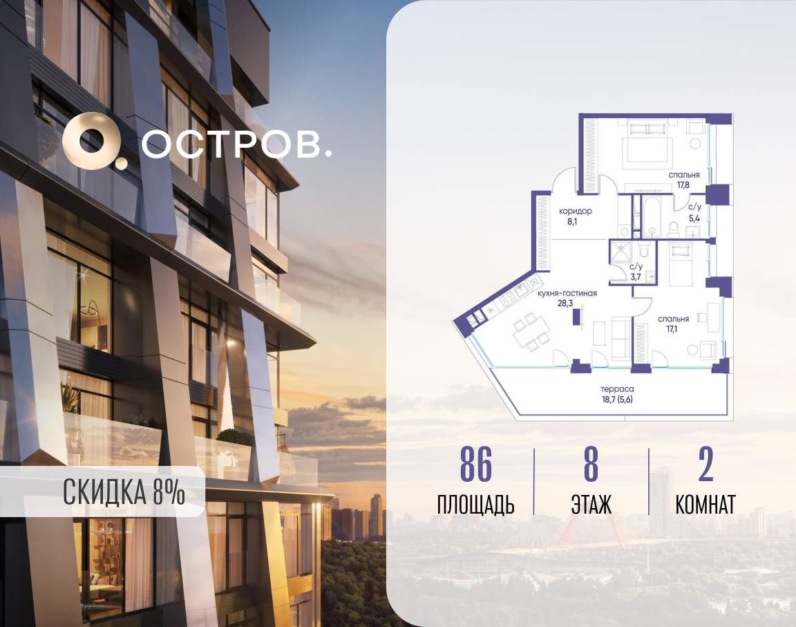 Продаётся 2-комн. квартира от застройщика: общая площадь 86.00 м, жилая 34.90 м, кухня 28.30 м, 8-й этаж, жилой квартал «Остров 12», корпус 1 (секция 1) . Срок сдачи: 1 квартал 2029 года.