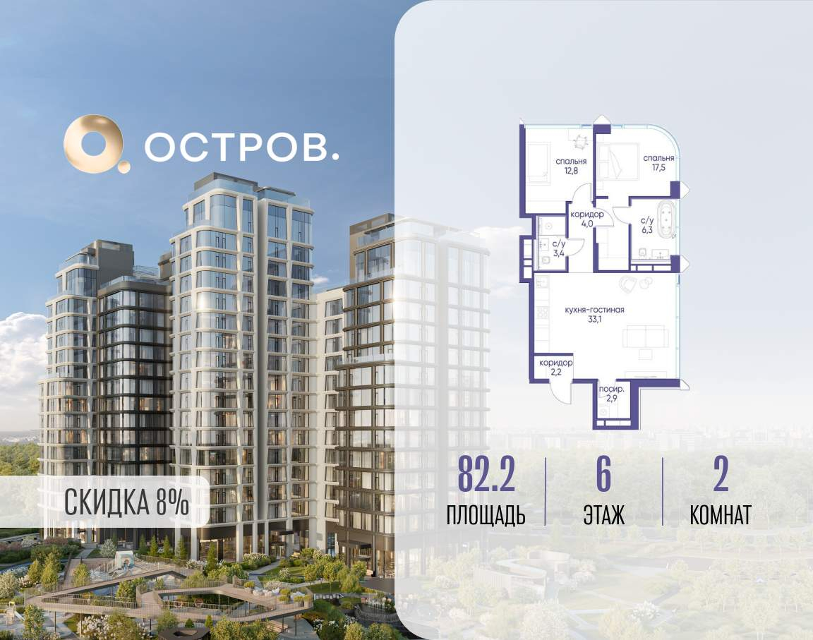 Продаётся 2-комн. квартира от застройщика: общая площадь 82.20 м, жилая 30.30 м, кухня 33.10 м, 6-й этаж, жилой квартал «Остров 12», корпус 2 (секция 2) . Срок сдачи: 1 квартал 2029 года.