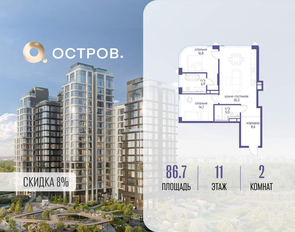 Продаётся 2-комн. квартира от застройщика: общая площадь 86.70 м, жилая 30.90 м, кухня 35.30 м, 11-й этаж, жилой квартал «Остров 12», корпус 2 (секция 2) . Срок сдачи: 1 квартал 2029 года.