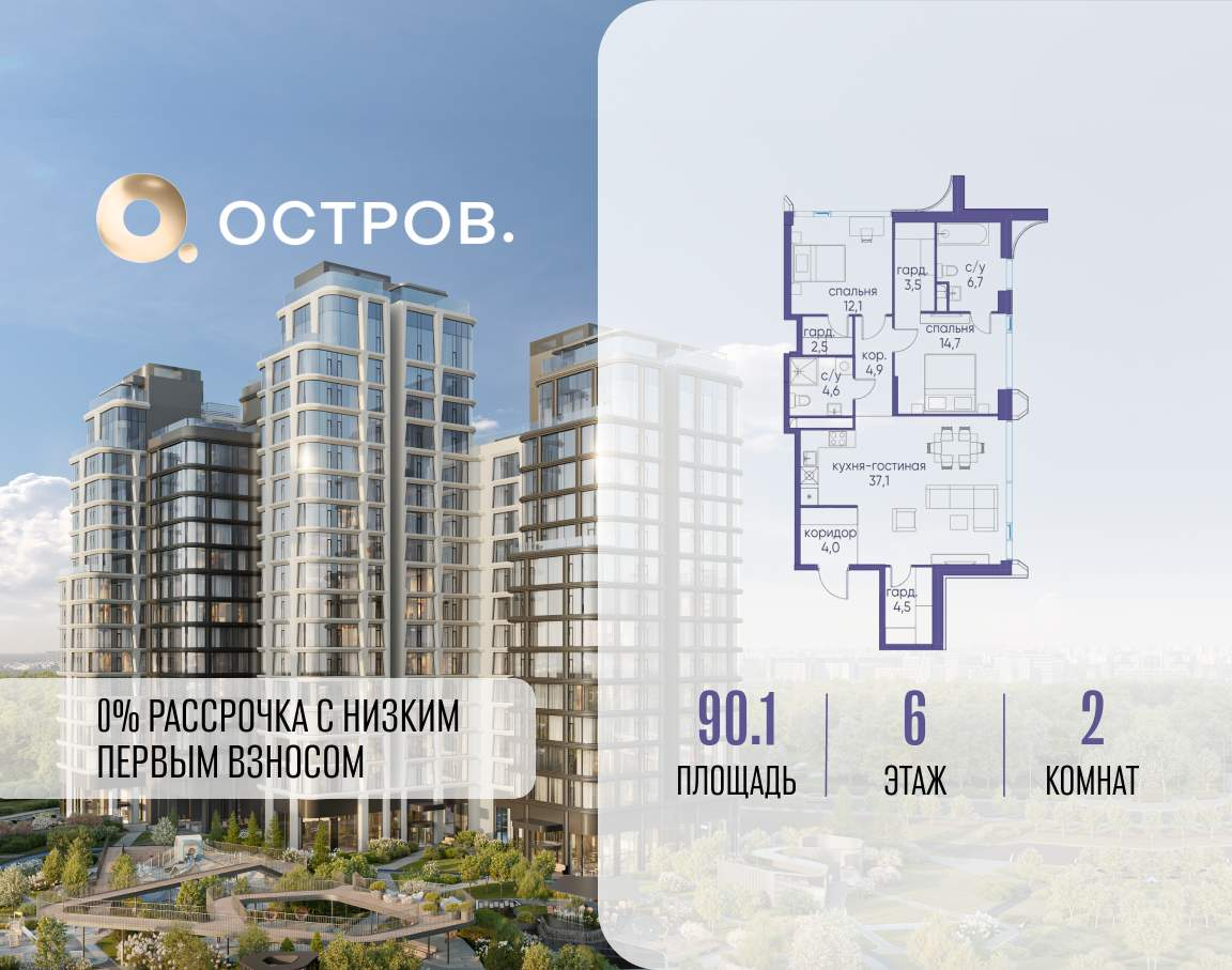 Продаётся 2-комн. квартира от застройщика: общая площадь 90.10 м, жилая 26.80 м, кухня 37.10 м, 6-й этаж, жилой квартал «Остров 12», корпус 1 (секция 2) . Срок сдачи: 1 квартал 2029 года.