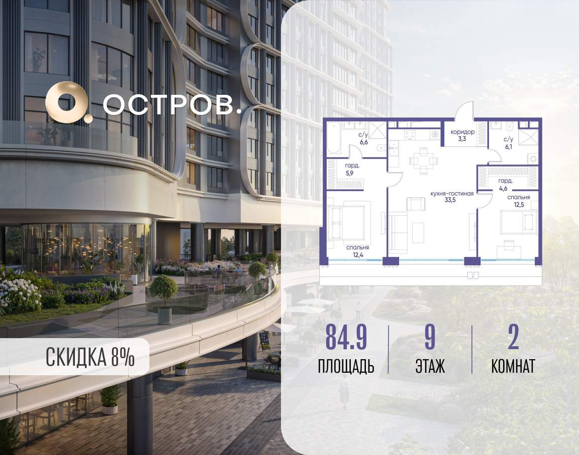 Продаётся 2-комн. квартира от застройщика: общая площадь 84.90 м, жилая 24.90 м, кухня 33.50 м, 9-й этаж, жилой квартал «Остров 7», корпус 6 (секция 1) . Срок сдачи: 3 квартал 2028 года.