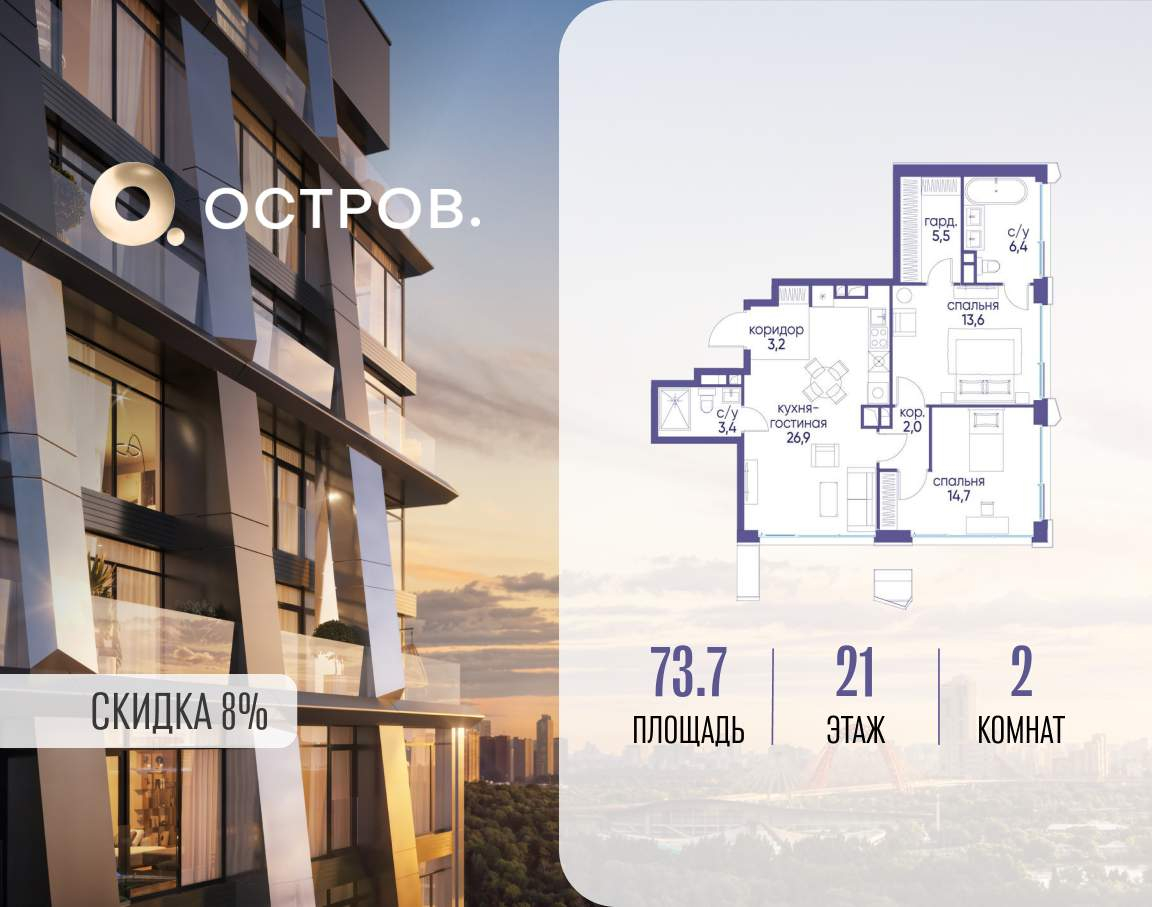 Продаётся 2-комн. квартира от застройщика: общая площадь 73.70 м, жилая 28.30 м, кухня 26.90 м, 21-й этаж, жилой квартал «Остров 12», корпус 3 (секция 1) . Срок сдачи: 1 квартал 2029 года.