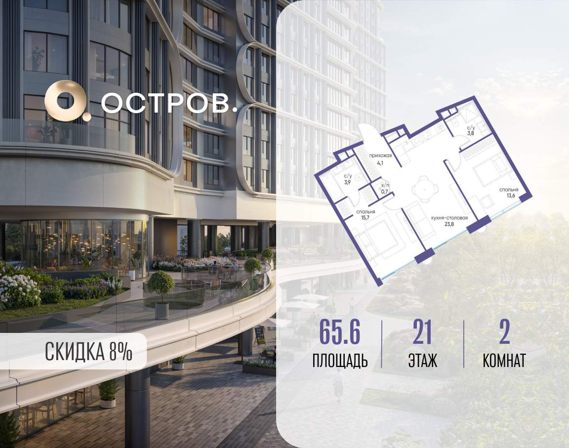 ОСТРОВ от Донстрой - жилой комплекс на западе Москвы, в Мневниковской пойме. Уникальное преимущество комплекса - в том, что он обособлен от города рекой и природным парком (650 га) . Благодаря природному окружению эта территория имеет лучший экологический рейтинг в столице. Кварталы ОСТРОВА объединены ландшафтным дизайном в единое пространство - с набережными и Центральным бульваром. На ОСТРОВЕ любые объекты, необходимые для полноценной жизни и отдыха, находятся на расстоянии 15-минутной прогулки. Торговый центр и супермаркеты, кафе и рестораны, фитнес, салоны красоты, школы и детские сады. А также крупнейший в Москве спортивный кластер.