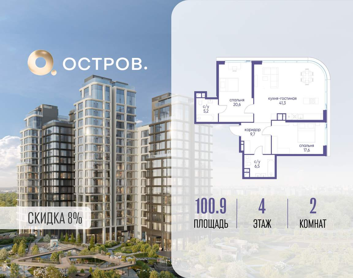 Продаётся 2-комн. квартира от застройщика: общая площадь 100.90 м, жилая 38.20 м, кухня 41.30 м, 4-й этаж, жилой квартал «Остров 12», корпус 6 (секция 1) . Срок сдачи: 1 квартал 2029 года.