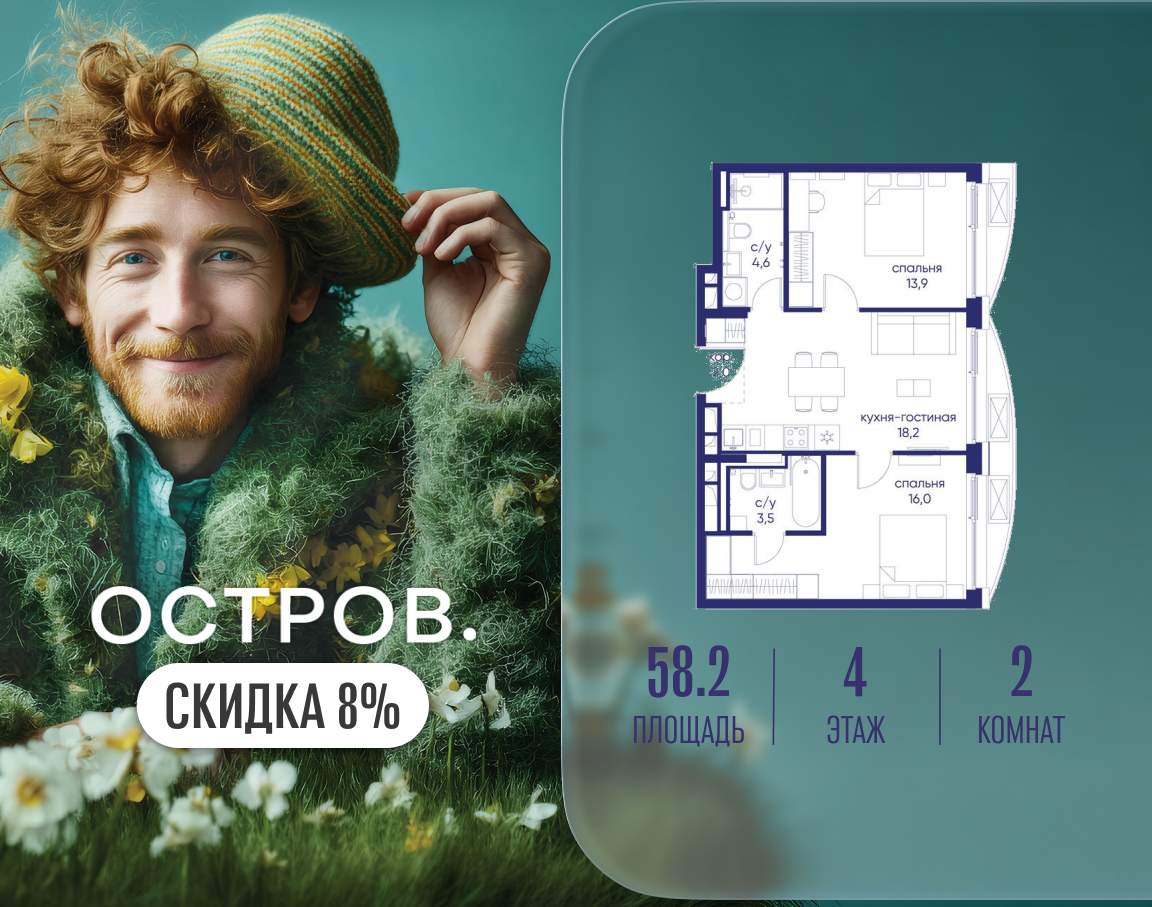 Продаётся 2-комн. квартира от застройщика: общая площадь 58.20 м, жилая 29.90 м, кухня 18.20 м, 4-й этаж, жилой квартал «Остров 14», корпус 1 (секция 1) . Срок сдачи: 2 квартал 2029 года.