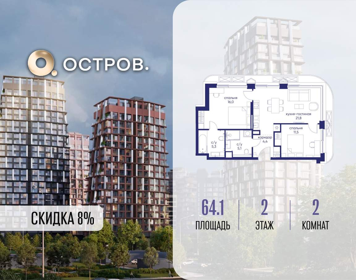 Продаётся 2-комн. квартира от застройщика: общая площадь 64.10 м, жилая 27.50 м, кухня 21.80 м, 2-й этаж, жилой квартал «Остров 14», корпус 1 (секция 2) . Срок сдачи: 2 квартал 2029 года.