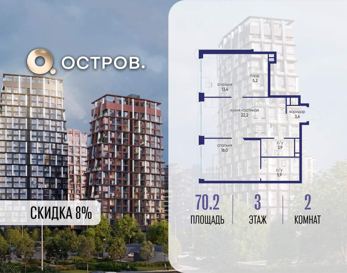 Продаётся 2-комн. квартира от застройщика: общая площадь 70.20 м, жилая 29.40 м, кухня 22.20 м, 3-й этаж, жилой квартал «Остров 14», корпус 6 (секция 1) . Срок сдачи: 2 квартал 2029 года.