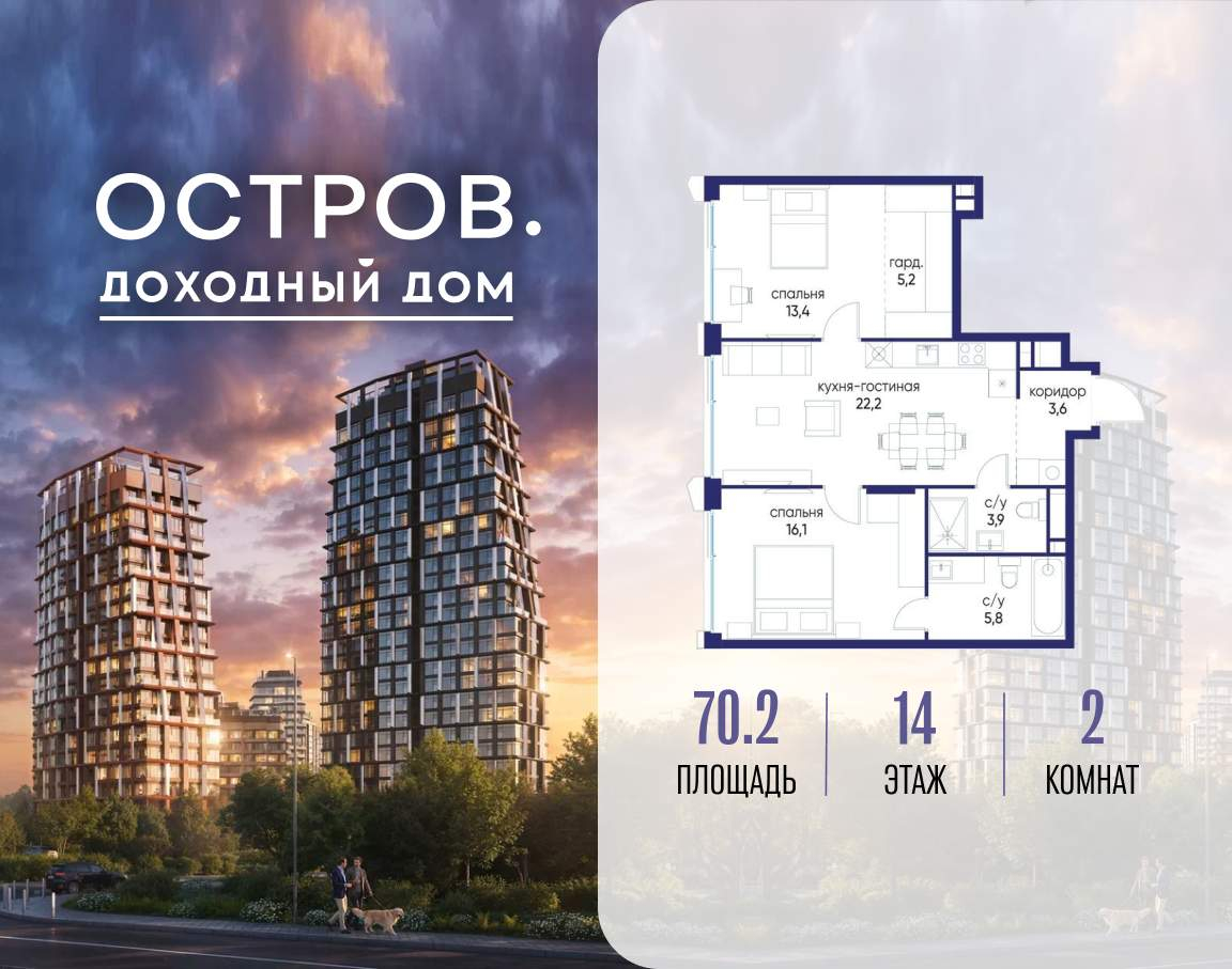 Продаётся 2-комн. квартира от застройщика: общая площадь 70.20 м, жилая 29.50 м, кухня 22.20 м, 14-й этаж, жилой квартал «Остров 14», корпус 6 (секция 1) . Срок сдачи: 2 квартал 2029 года.