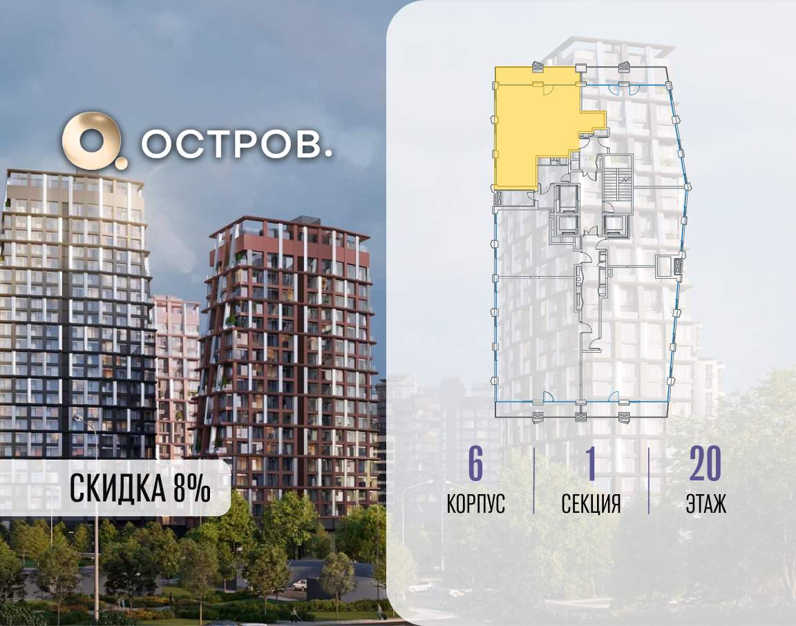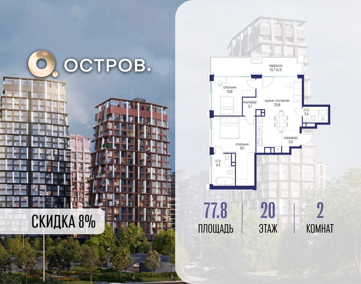 Продаётся 2-комн. квартира от застройщика: общая площадь 77.80 м, жилая 32.90 м, кухня 25.80 м, 20-й этаж, жилой квартал «Остров 14», корпус 6 (секция 1) . Срок сдачи: 2 квартал 2029 года.