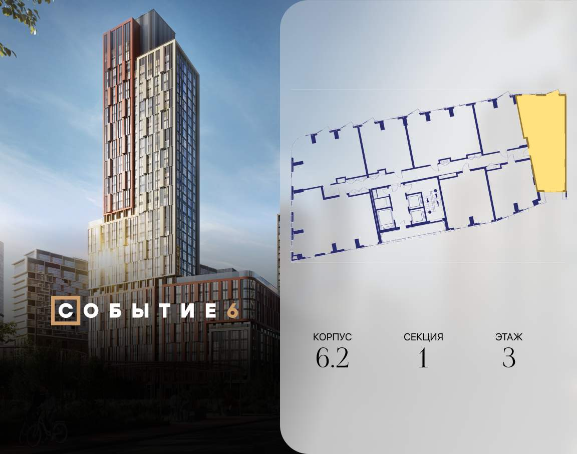 Продаётся 2-комнатная квартира от застройщика: общая площадь 78.30 м, жилая 29.90 м, кухня 22.80 м, 3-й этаж, жилой квартал «Событие-6», корпус 2 (секция 1) Срок сдачи: 1 квартал 2029 года.