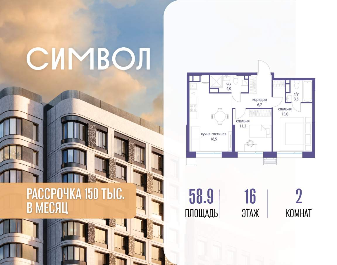 Продается 2-комнатная квартира от застройщика: общая площадь 58.90 м, жилая 26.20 м, кухня 18.50 м, 16-й этаж, жилой квартал «Гордость», корпус 36 (секция 5) . Срок сдачи: 2 квартал 2029 года.